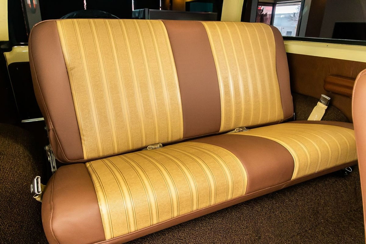 The classic Bronco is brown and beige two-tone with the same colors in the interior. Power comes from a modified 351 cubic-inch V8 engine backed up by a three-speed automatic C6 transmission. One of the best parts about these older Broncos is that the hardtop on the rear half is removable. This example also has a row-down window, 15-inch polished aluminum wheels, 33x12.5 Mickey Thompson Baja ATZ tires, spare tire, chrome bumpers, rear hitch receiver, and perfectly polished trim all around.