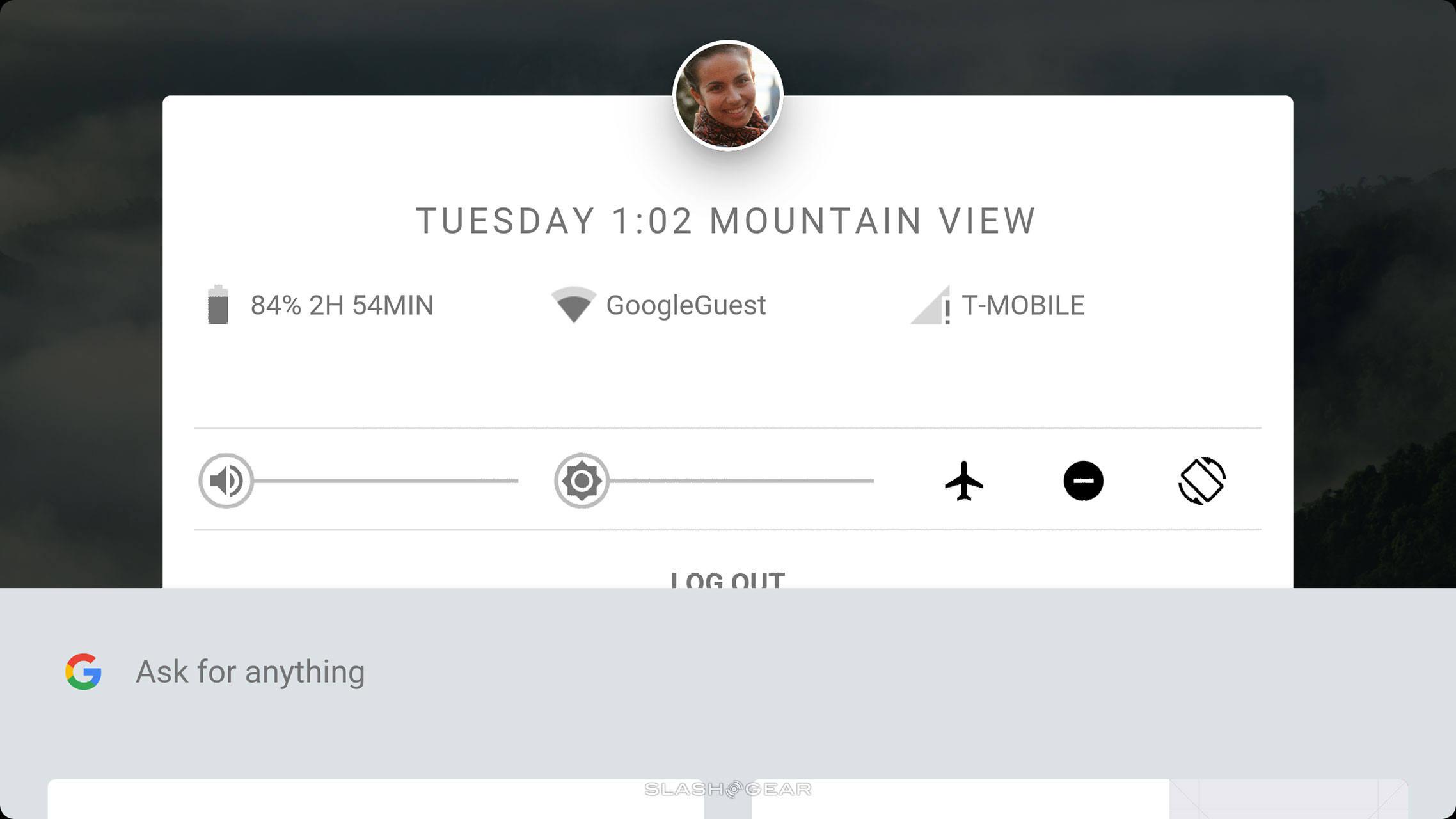 Inside Fuchsia Armadillo is a user interface that's based on Material Design. This UI has a center panel which shows a few basic details about the user supposedly using the device, the time and the date. The basic module includes the day, time, and location, as well as a battery level icon. Tapping that – or the icon of the user in the center – brings up additional info and options.