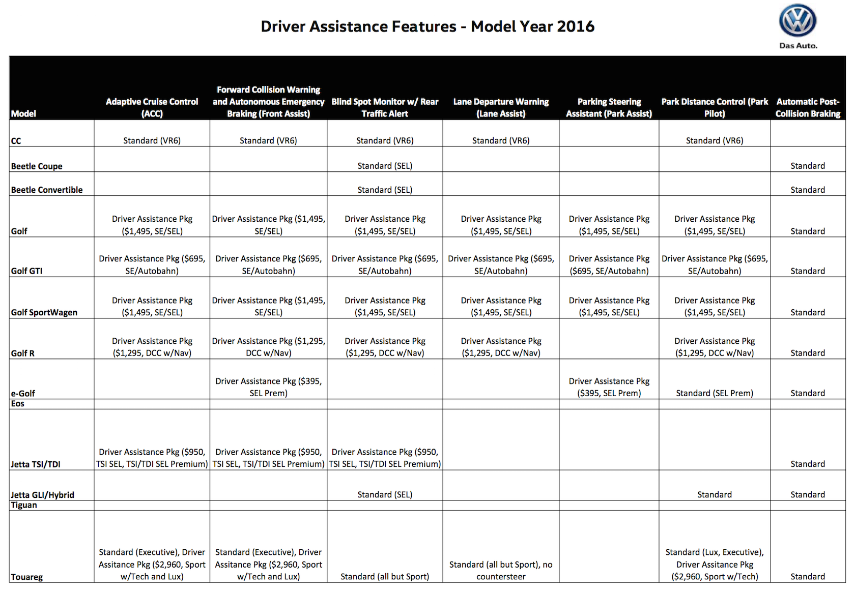 What today's announcement does do is catapult VW to among the front players in the pack. Not every driver aid will be offered on every car, of course; the Golf will get the most, with adaptive cruise control, forward collision warnings and emergency braking, blind spot monitoring with rear traffic alerts, lane departure warnings, park assist, and park distance control available as options on almost all variants.