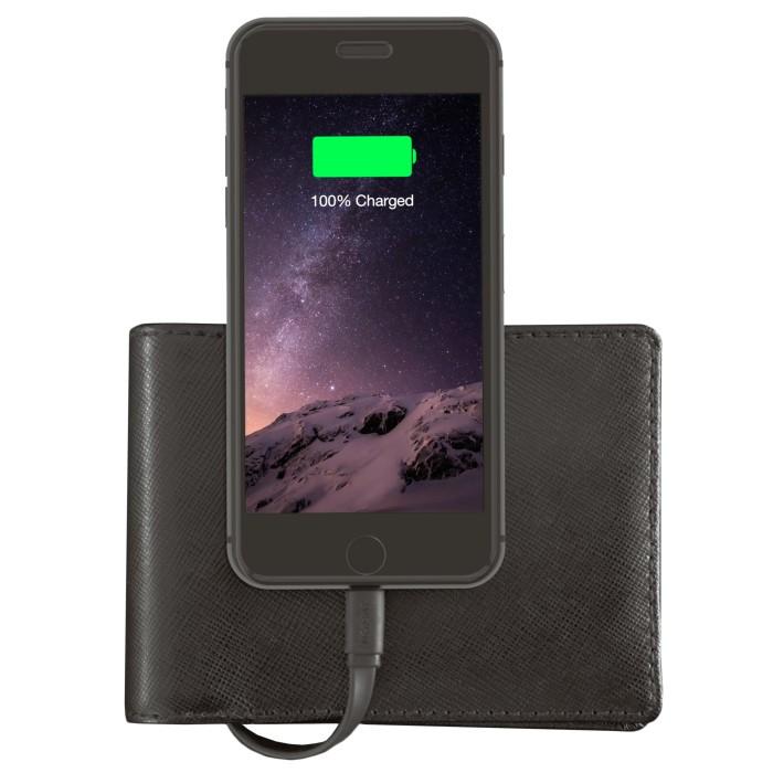 The leather wallet stores the battery in its folding spine, and it connects to an iPhone via a 3-inch certified Lightning cable that stays tucked away when not in use. Nomad says the 2,400mAh battery should be more than enough to fully re-charge iPhone models before the 6, and can charge the new iPhone 6s to around 100%.