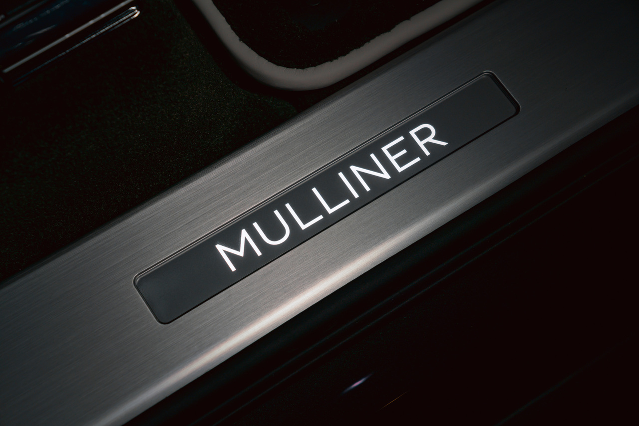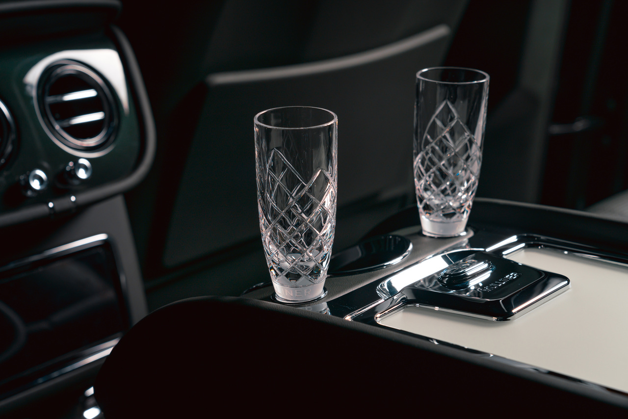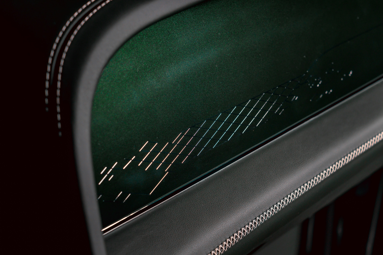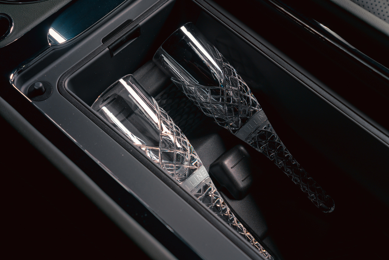 Opening the doors reveals illuminated Mulliner treadplates, green veneers, and luscious Cumbrian Green upholstery with contrasting white stitching. The latter takes a single craftsperson 44 hours to complete and is prevalent on the door interiors and seatbacks, said Bentley. Also, you'll find a drinks cooler in the center console with two handcrafted Cumbria Crystal flutes.