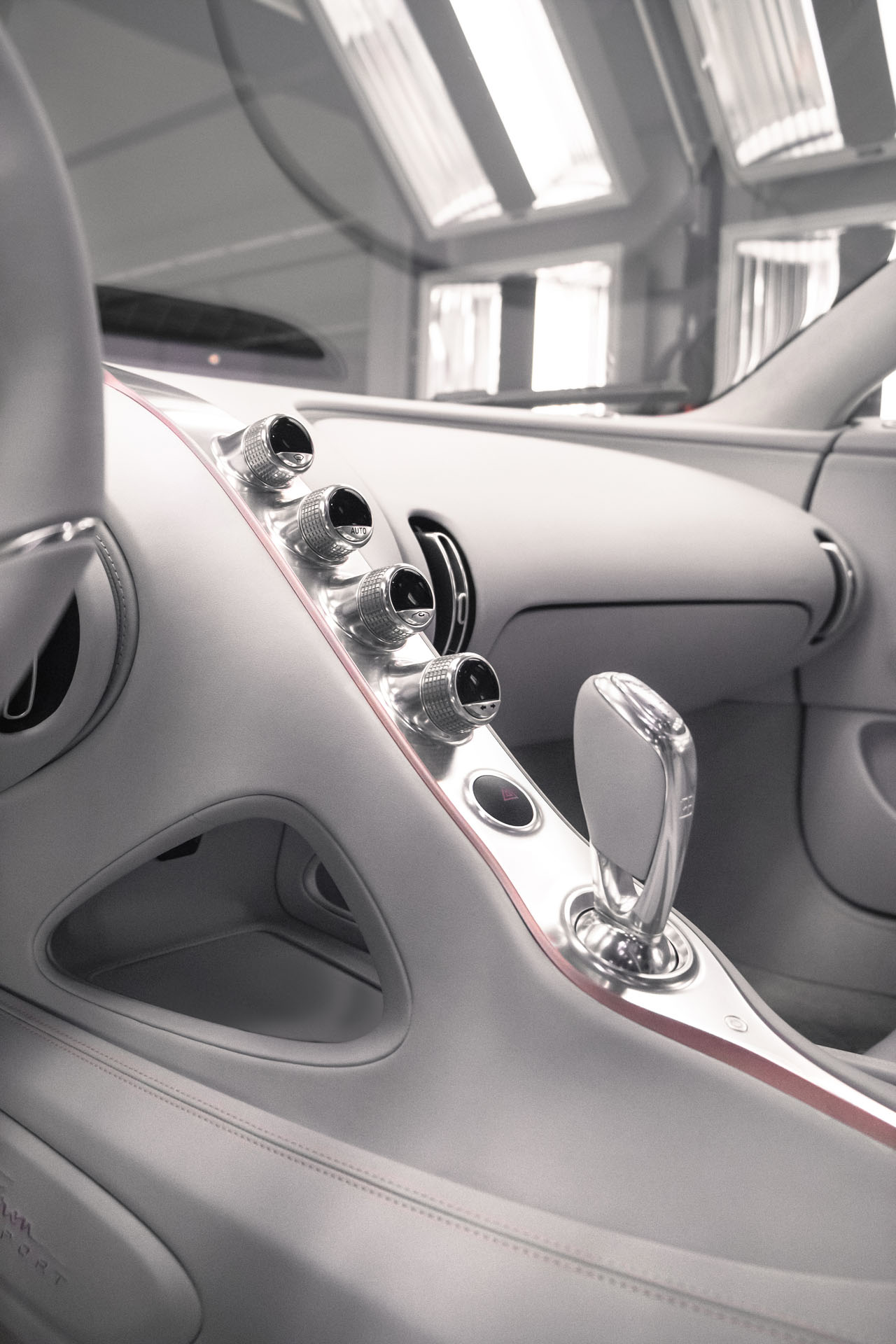 The Chiron Sport is finished in Matte Blanc and Silk Rose, which is a new Bugatti color selected just for this car. The car was completely customized to the customer's wishes and is like no other Bugatti made before. Silk Rose was created to combine with the shade of Matt Blanc, which the images appears to be a matte white color. Much of the car is covered in a pink hue, including touches on the wheels and in the interior.