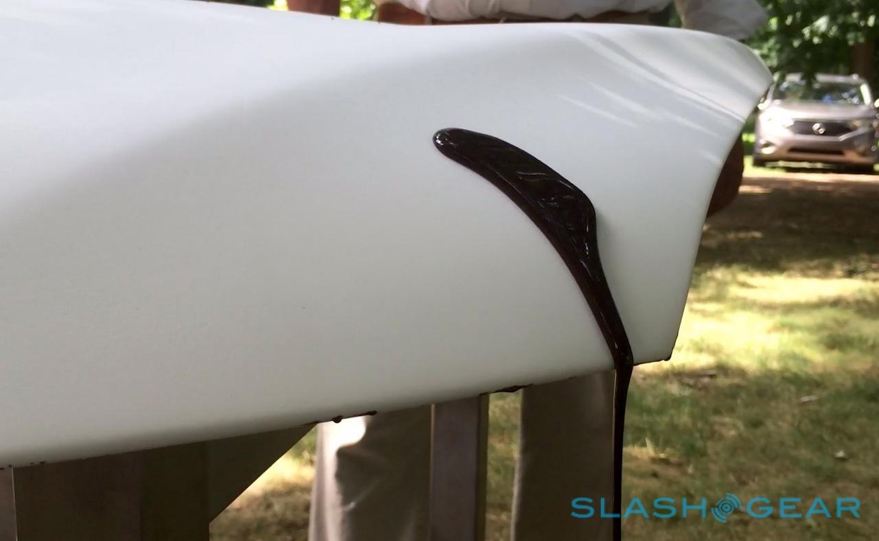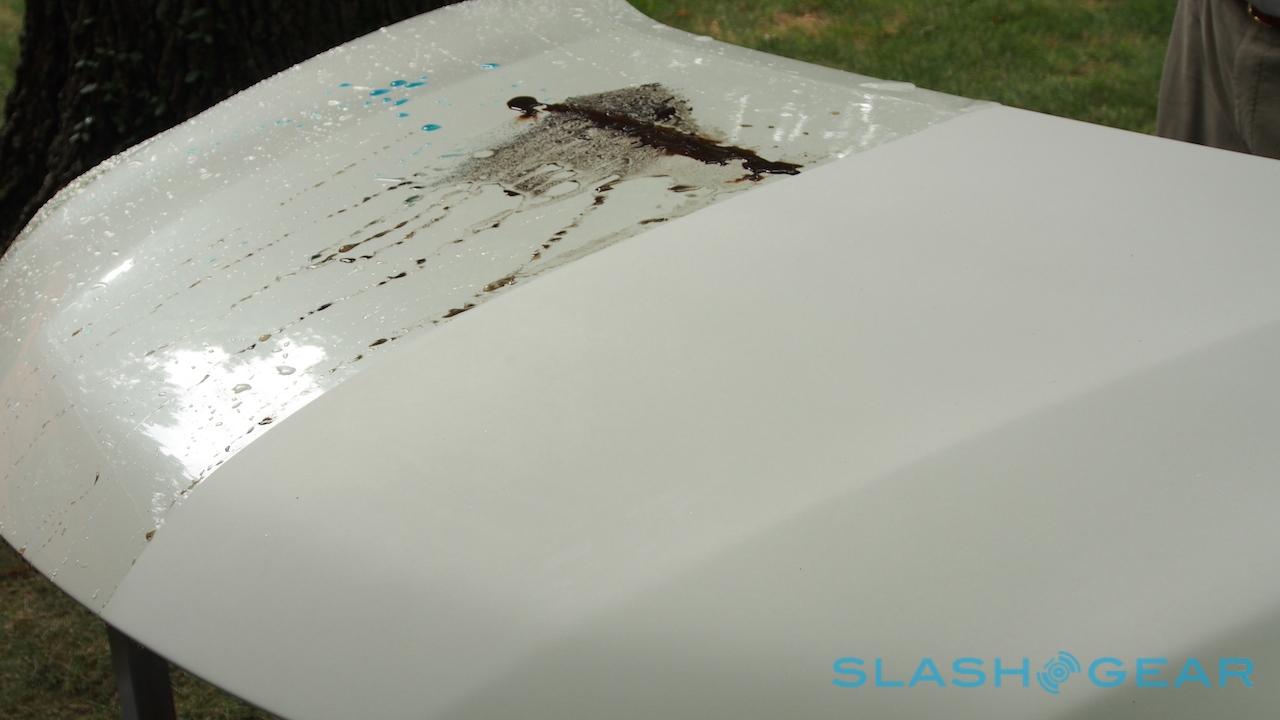 Shaw had a second Leaf hood only half-treated to demonstrate the difference, the standard paint left smeared and messy while the other section refused to get dirty. There's something mesmerizing about watching water unexpectedly bead almost like it's just floating; that beading can also pick up dust and other particulates and carry them off too, meaning not only does this particular Leaf shed dirt, it actively cleans itself.