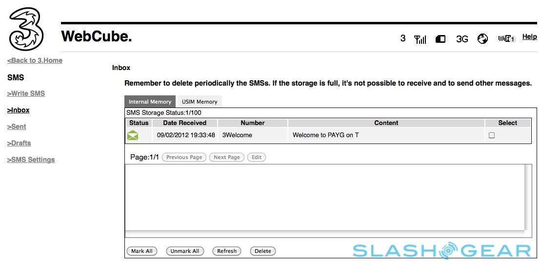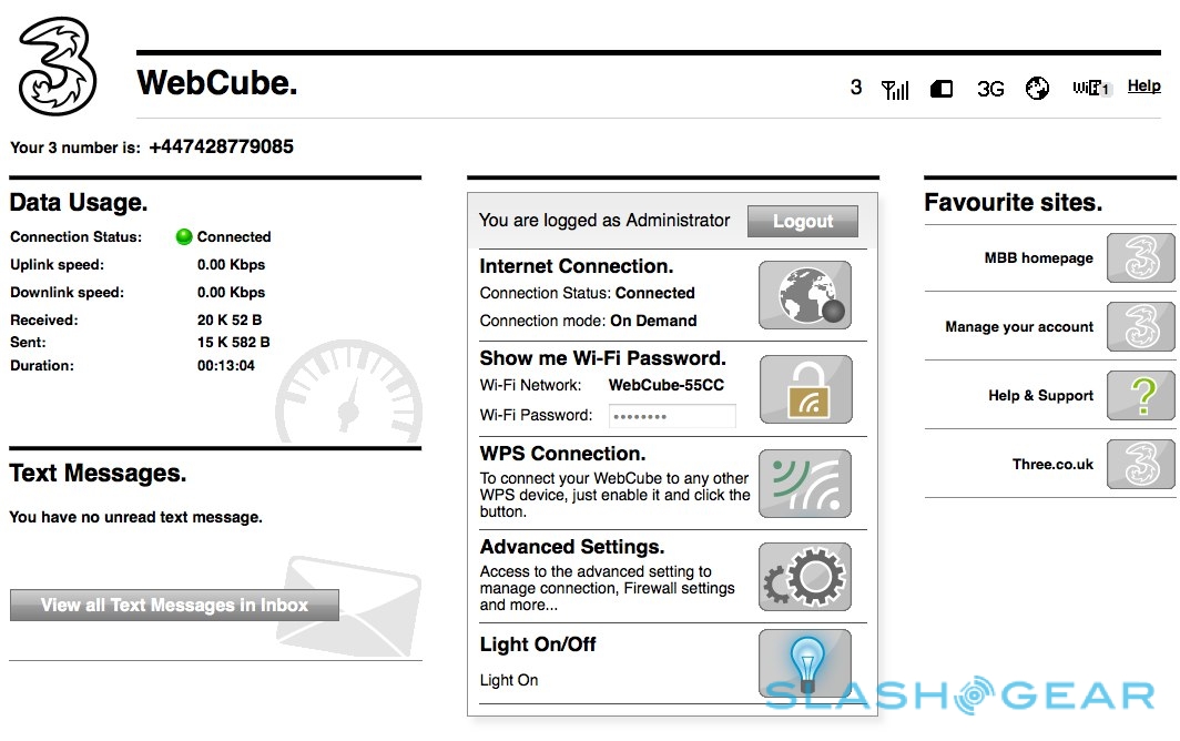 As with most routers, there's a browser-based control panel for checking status and accessing more complex settings. The home view shows data connection, upload/download speeds and a data counter, along with icons for signal status and how many WiFi clients are connected; you can also turn off the main body light. There's also text message support, including incoming and outgoing messages; it's worth noting that any WiFi user can access this and send SMS billed to your account. While you can't turn off text messaging or lock it down with a passport, you can put in an incorrect service center number and block the functionality that way.
