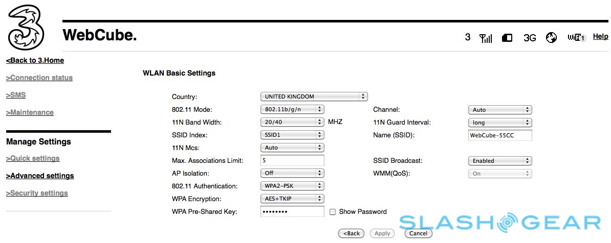 Both the SSID and WPA2 encryption key are preconfigured, each printed on the base of the Web Cube as well as on the back of the quick-start guide. We were connected and surfing in sixty seconds from plugging the modem in, in fact.