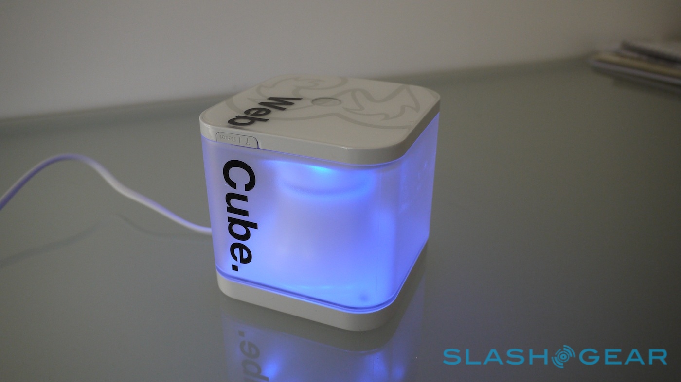 While the key components of the Web Cube may be the same as your average, pocket-sized mobile hotspot, the device as a whole is much bigger. Almost a 10cm cube (it's 9.5cm high) it's a distinctive addition to your desktop, with white base and top plates sandwiching a frosted midsection that reveals a fluted inner pillar. An array of blue LEDs cause the whole thing to glow when a device is connected via WiFi.