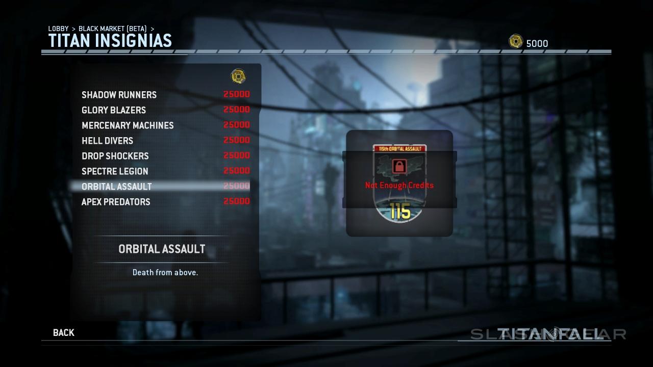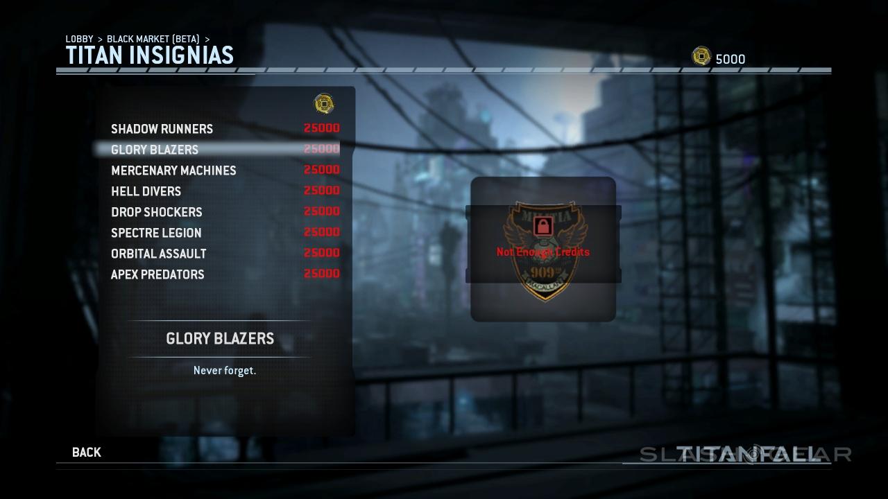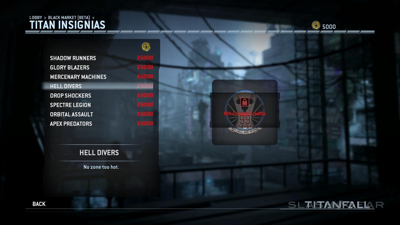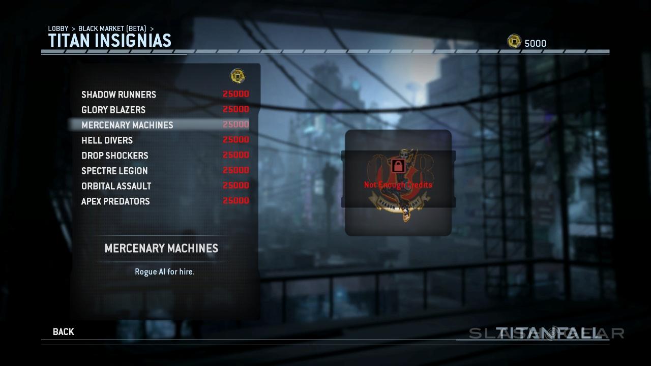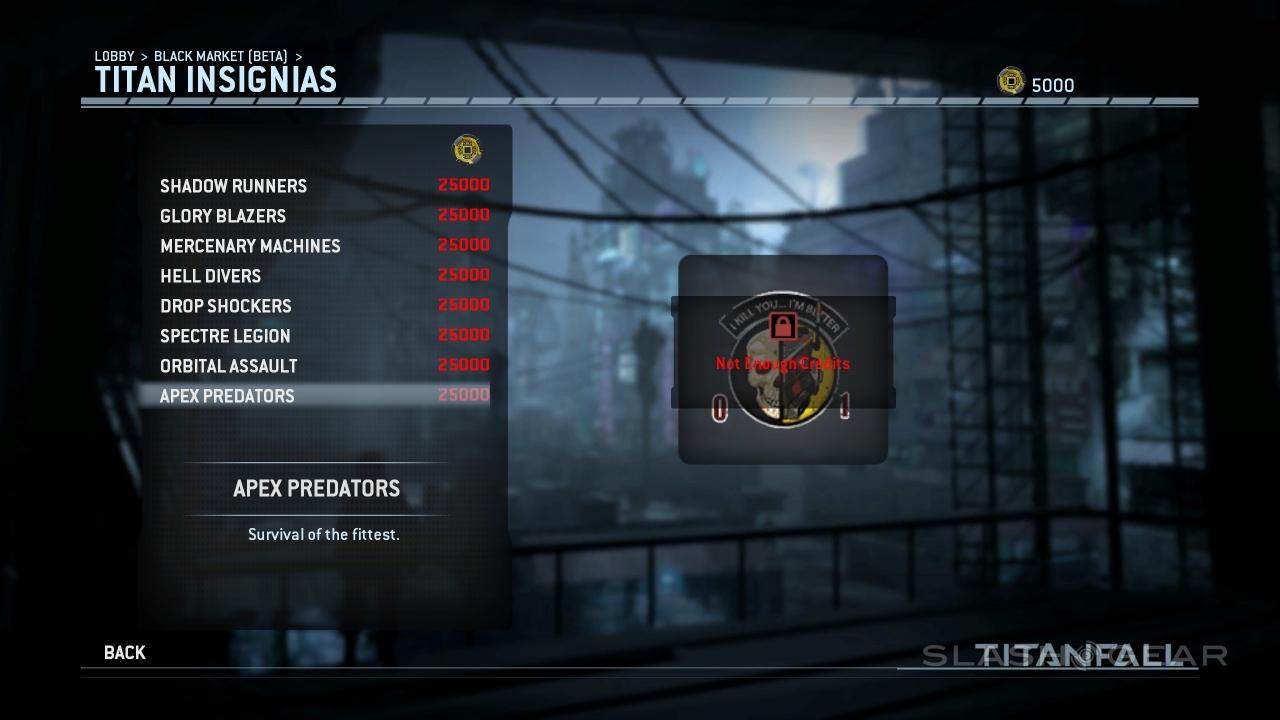 You'll also be able to spend credits on new Titan Insignias. Shadow Runners, Glory Blazers, Mercenary Machines, Hell Divers, Drop Shockers, Spectre Legion, Orbital Assault, and Apex Predators are available from the start. Check out Apex Predators for the best tag-line of the bunch: "I Kill You... I'm Better." Or "I'm Butter" – the second letter of the last word is blocked.