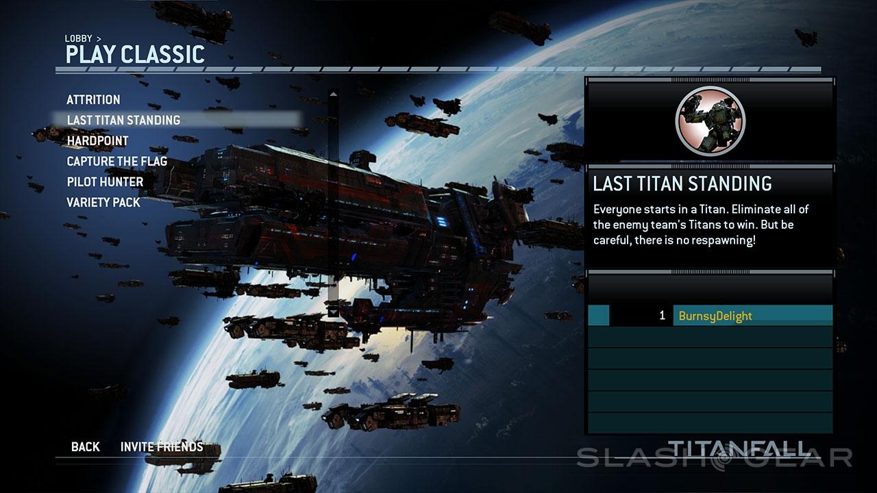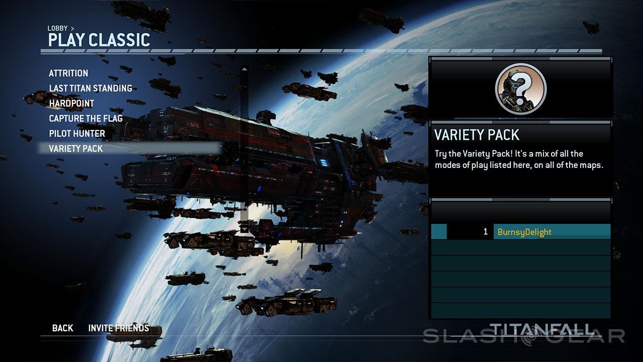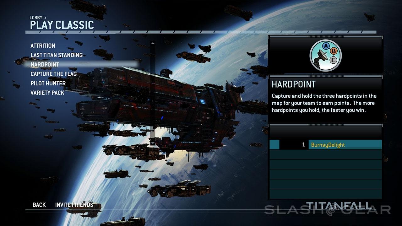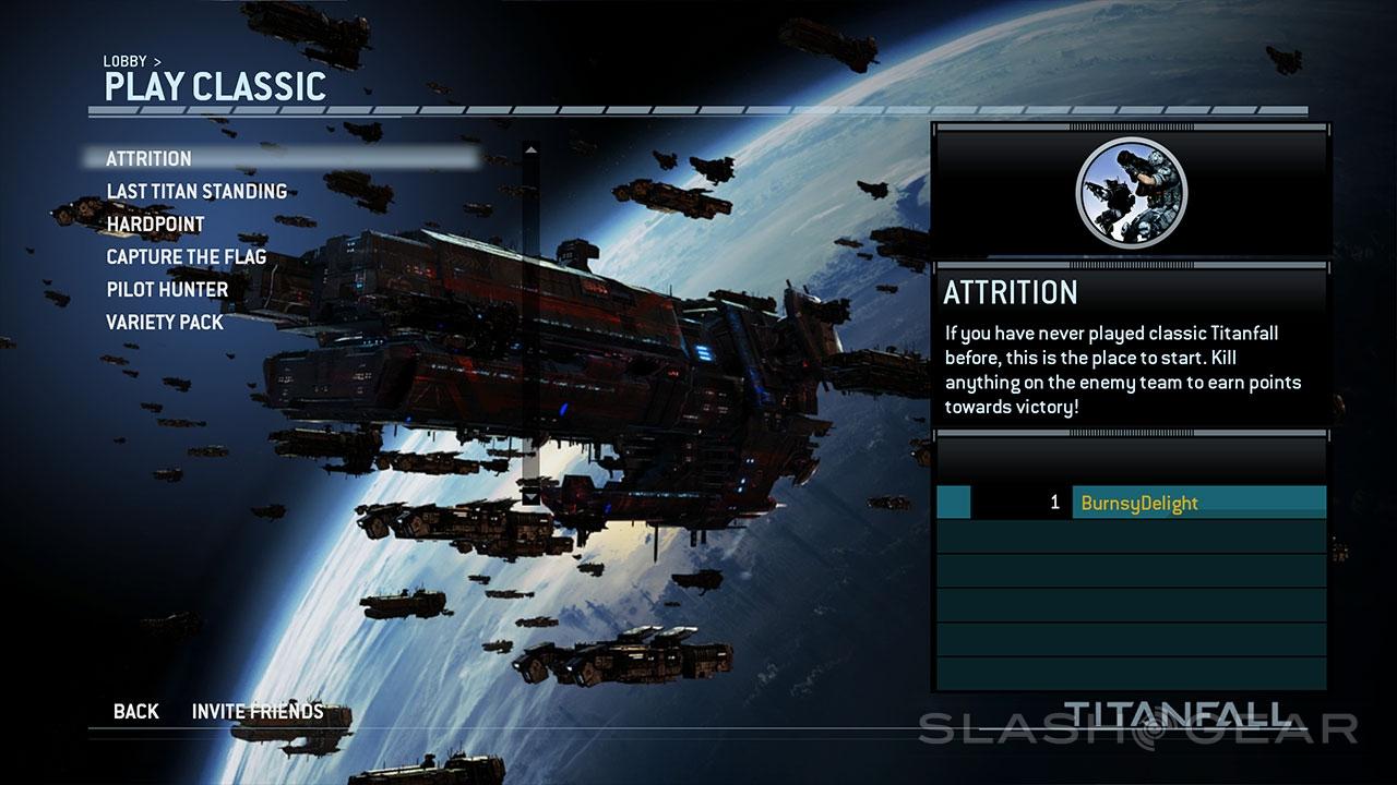 There are two overarching types of gameplay in Titanfall, one called Classic Mode. Here you're playing in a multiplayer arena in game modes you may recognize in their most basic form. These include Attrition, Last Titan Standing, Hardpoint, Capture the Flag, Pilot Hunter, and "Variety Pack." The last is a random selection of the other modes, while the others are a little less obvious.