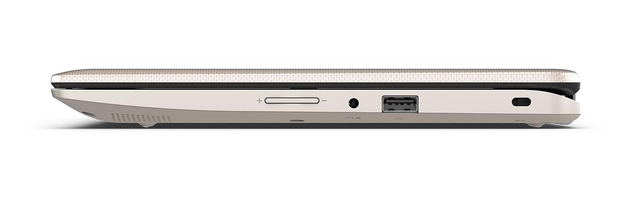 Up top you've got a "trendy patterned light gold finish" while above the display you'll have an HD webcam. Along the left and the right you'll have 1x USB 3.0, 1x USB 2.0, a full-size HDMI-out, and an SD card slot to work with.