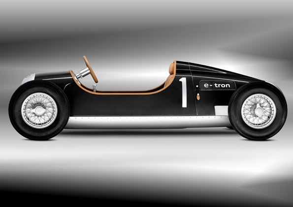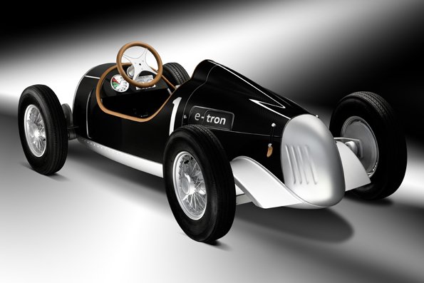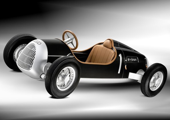 Take a peek this magnificent machine. It's all black with tan interiors, no top, a big fat "1" on the side, and wheels that'll last you just so long as you don't go offroad at all, whatsoever. What the heck is this thing? It's the Audi Auto Union Type C e-tron study, of course. It's got electric drive, a smooth sailing body, and plans on being released into the wild at the International Toy Fair this early February, just so long as it gets its wish.
