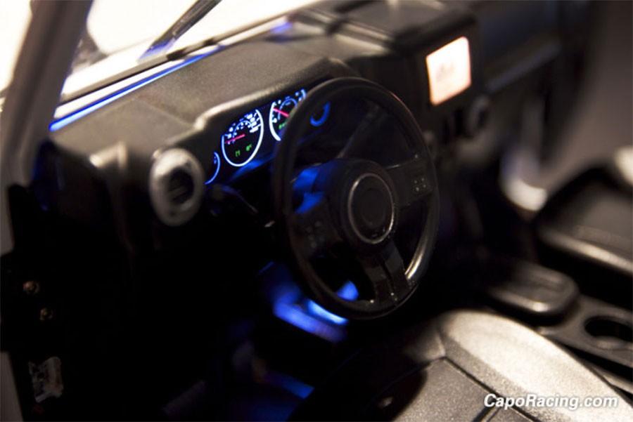 This little beast is 24-inches long, 10-inches high, and 10-inches wide. It has a tiny backlit dashboard, reclining seats, working driveshaft, and doors and a hood that opens. Under the hood, every little detail from the real Wrangler is there with belts, springs, air cleaners, and more.
