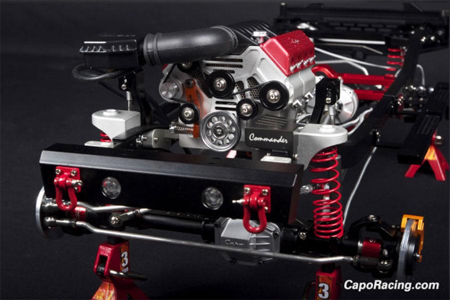 The engine bay even has a light so you can get a better look at all the detail. The toy has a 3-speed transmission, locking diffs front and rear, and a transfer case that can switch into and out of 4x4 mode. The beast even comes with jack stands.