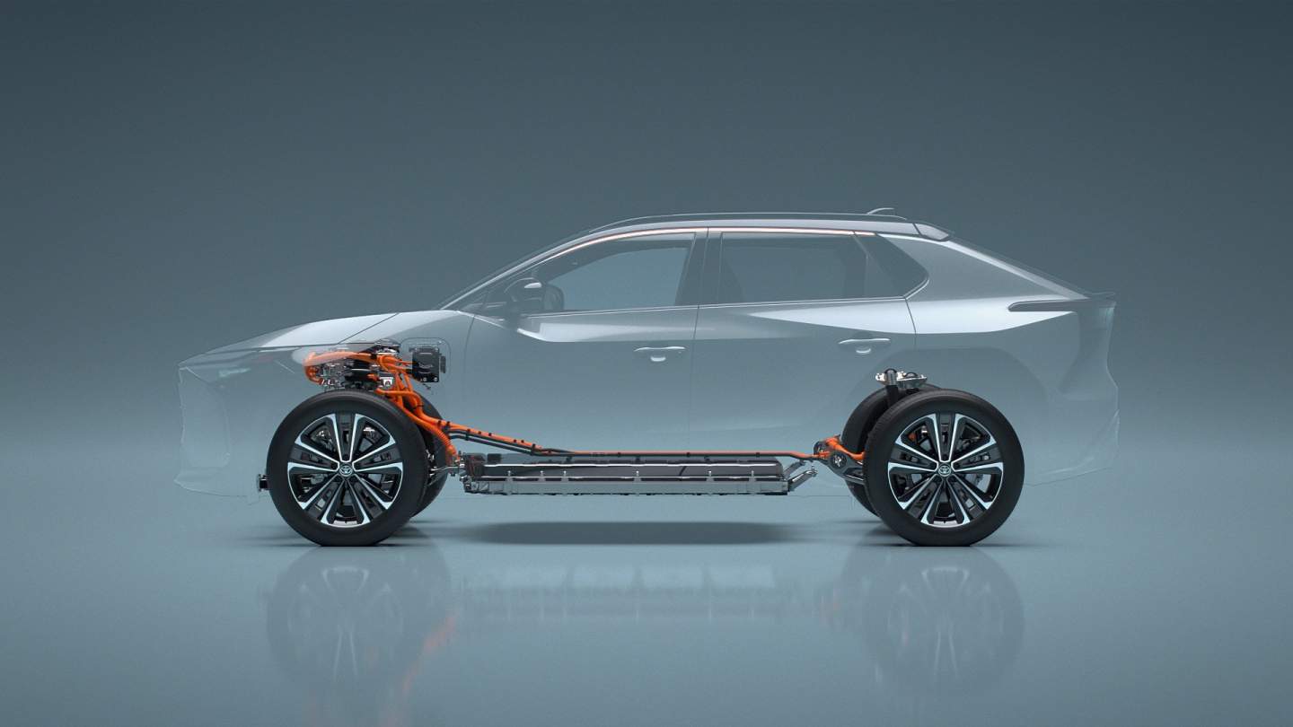 The bZ4X has a 165 mm longer wheelbase than a RAV4 hybrid. It also has shorter overhangs and sits 85mm lower. Toyota is also adopting Subaru's AWD and X-MODE technologies (the first for Toyota) to improve traction on all types of roads, including light off-road driving.
