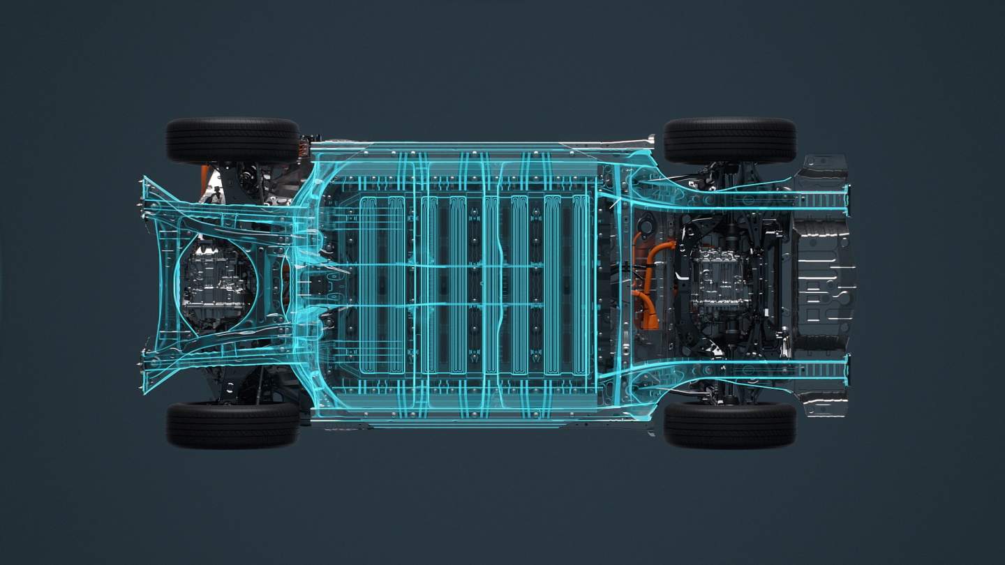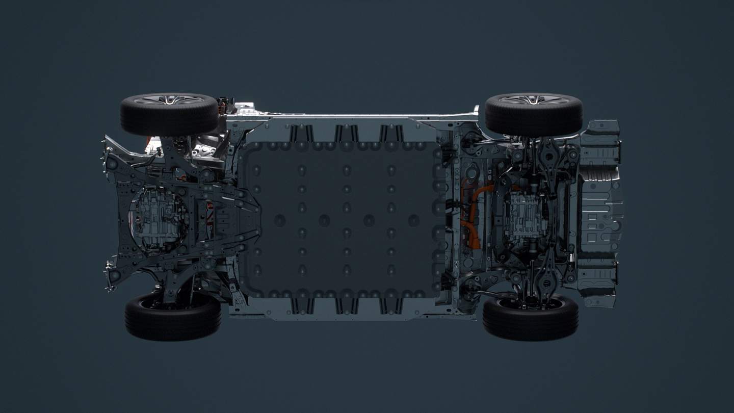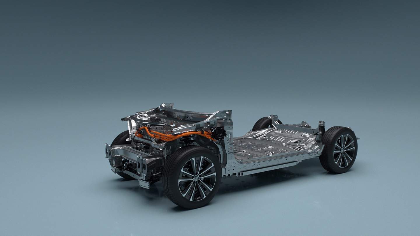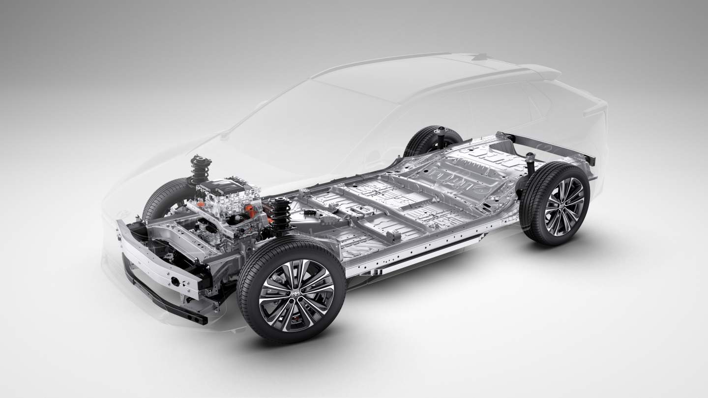 The 2022 Toyota bZ4X (beyond Zero) will ride on a BEV-dedicated platform based on Toyota's modular e-TNGA architecture. It's similar to the underpinnings of the Subaru Solterra with a thin battery pack under the floor and an integrated E-axle, merging the electric motor, inverter, and transaxle into a single unit.
