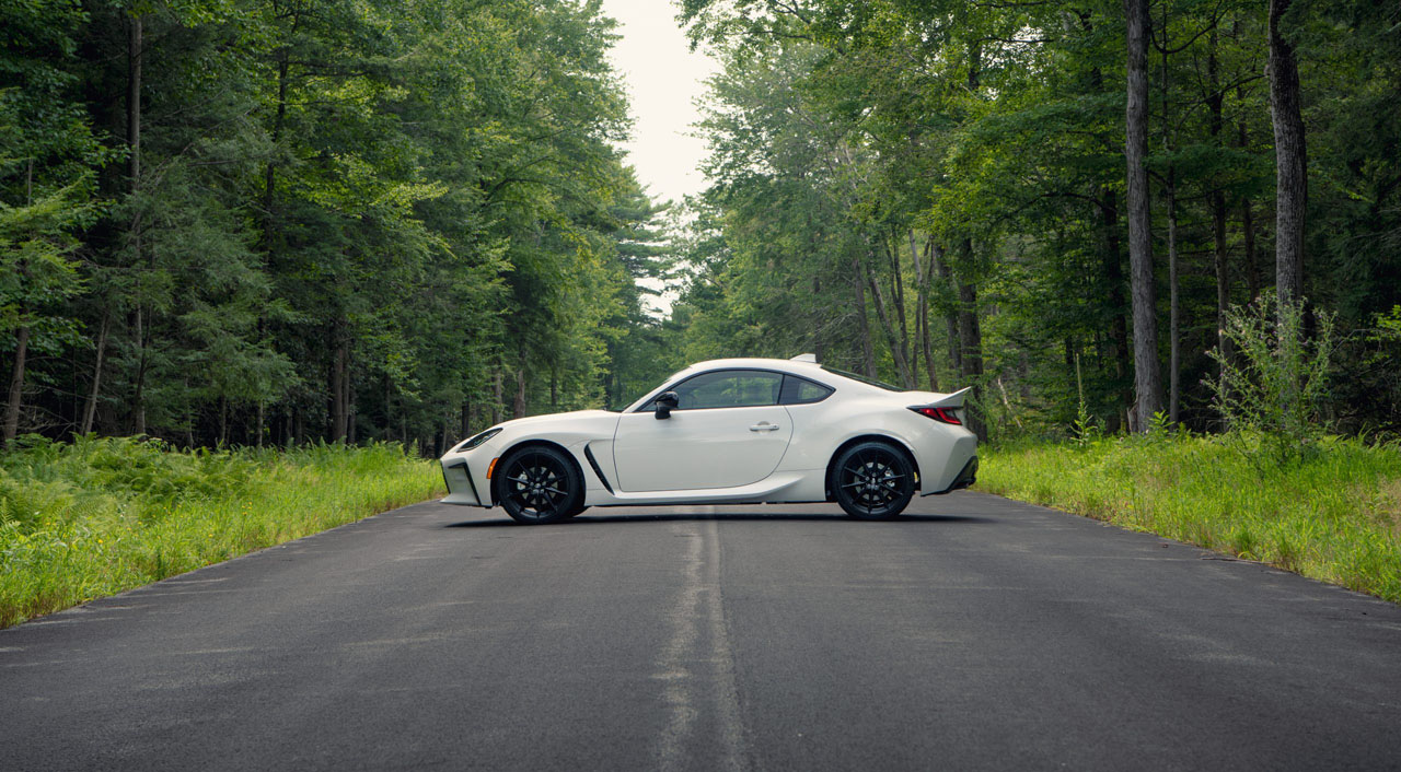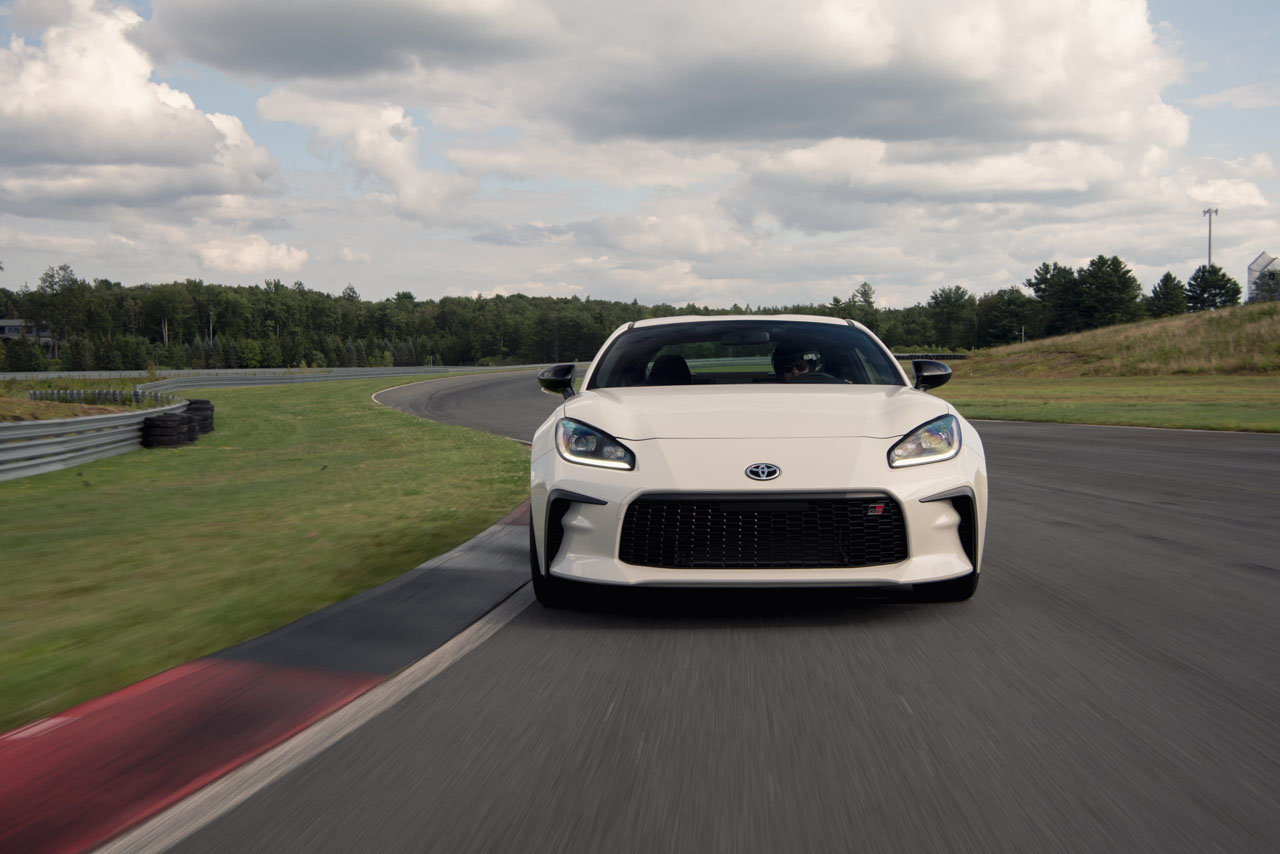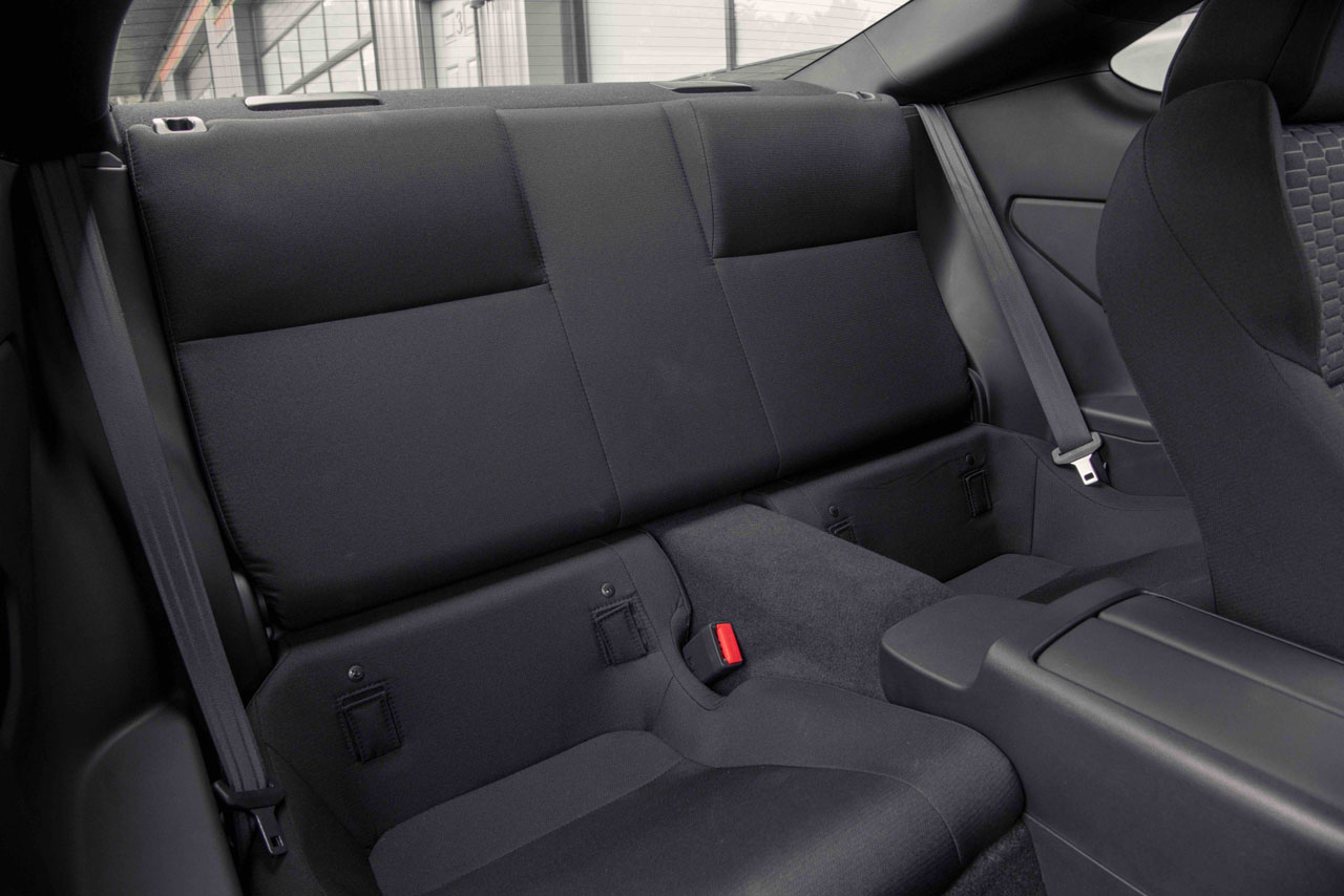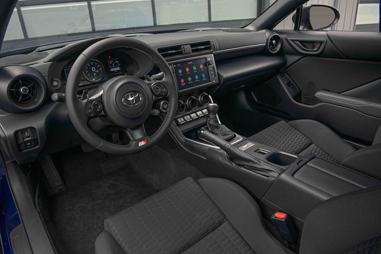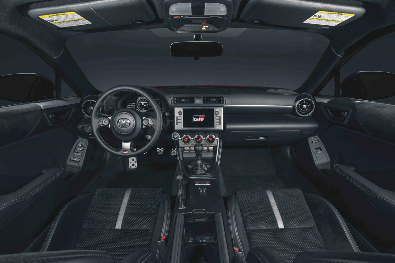 The base GR86 has 17-inch wheels and uses Michelin Primacy HP tires. The black seats are six-way adjustable, featuring G-embossed fabric with sport fabric side bolsters offering textured vinyl. The car also gets sport fabric trim on the dash, doors, and steering wheel, along with an eight-inch touchscreen multimedia system with six speakers. Buyers can choose a manual transmission or paddle-shift automatic.