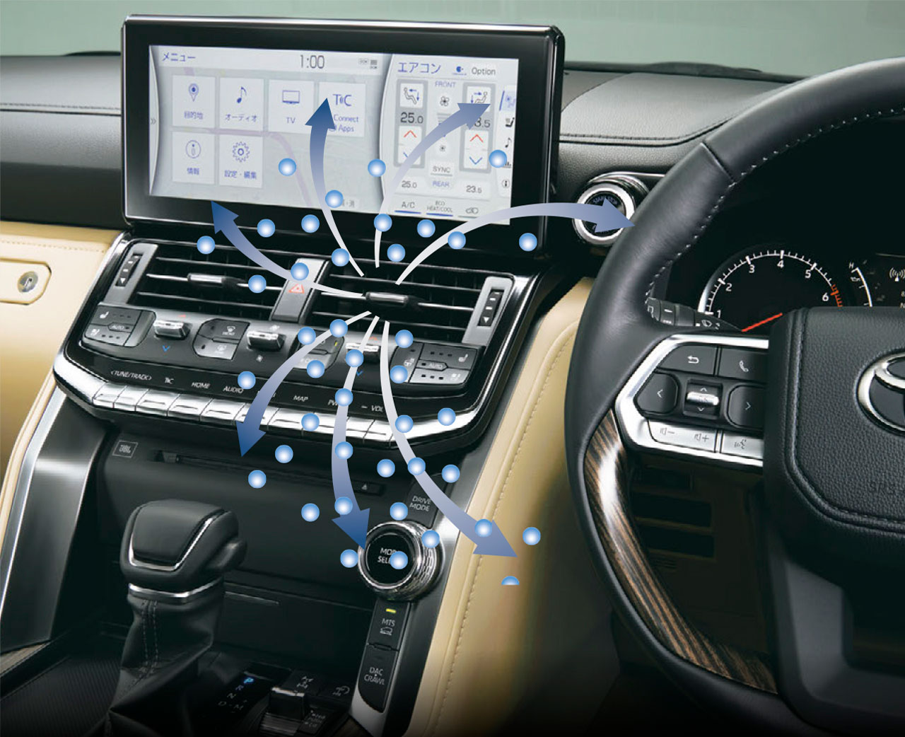 Toyota uses hydraulic power steering with a steering actuator meant to survive harsh environments and electronic braking control. The vehicle has a rear Torsen limited-slip differential and multi-terrain select all-road driving system with six modes. A Multi-Terrain Monitor system utilizing four cameras positioned in the front, rear, and on both sides of the vehicle helps the driver check conditions on all sides. Powertrains include a 3.5-liter twin-turbo V-6 that runs on gas, producing 415PS and 650 Nm of torque.