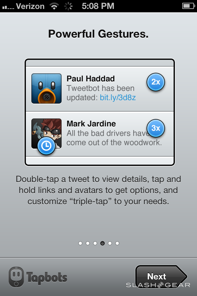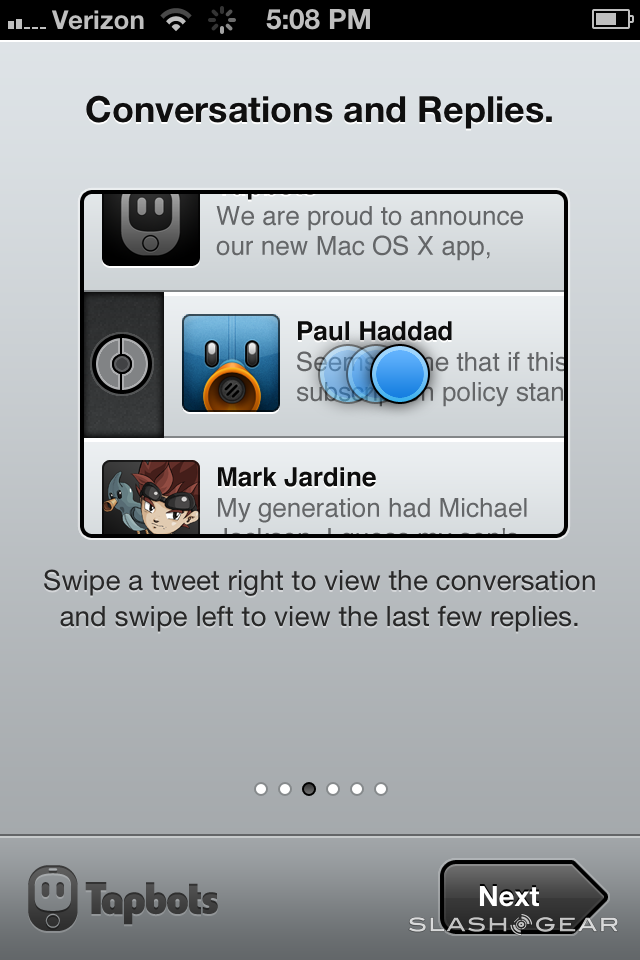 When you double-tap on a users profile, you'll be taken to their profile on Favstar. If you double-tap on the direct messages tab, you get the option of marking all of your DMs as read at once. There's even a triple-tap for each tweet, your options being several including replying or starring that tweet as a favorite. To access a Tweet's entire conversation, you've only to swipe to the right. If you want to see any replies that a single tweet has gotten, swipe left.