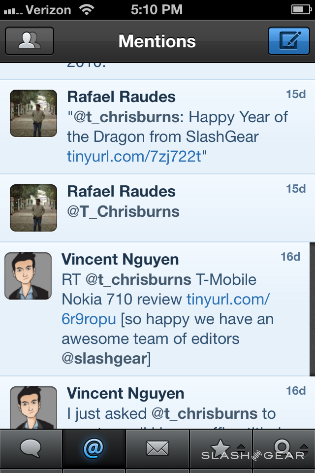 Once you sign in, you'll see your Twitter feed on the leftmost tab, your mentions next, messages, then two custom tabs. In these tabs you'll have a selection of Favorites, Lists, Retweets, Mute Filters, Search, and your Profile. These two buttons have all of these options but will not repeat the same option twice. It's kind of magical like that. Your interface gives you all the options you get on the desktop web browser version of Twitter and more – connections!