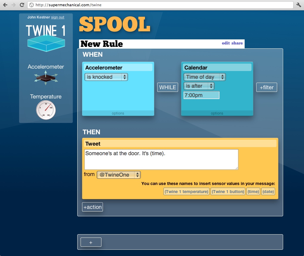 As standard, Spool can fire of Twitter and text messages, along with emails, and also output HTTP requests for more complex systems. They're expected to be the minority, though: Twine is intended to be simple, and developers Supermechanical hope it will be picked up by non-programmers keen to get their household appliances and other gadgets internet-connected.