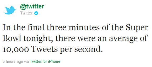 Twitter has released one very interesting statistic. An official tweet from Twitter has announced that during the final 3 minutes of the Super Bowl there was an average of 10,000 tweets every second. That's an insane number to me 600,000 tweets in a minute and over that three minute span 1.8 million tweets were made.