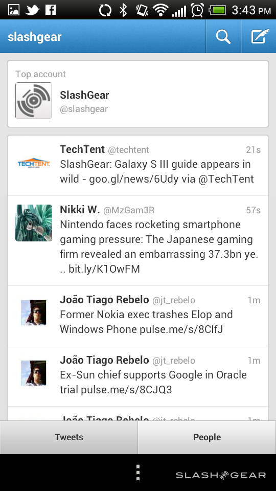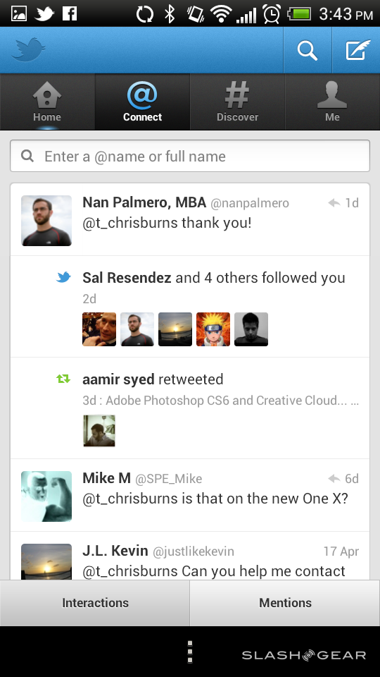Then there's Search which, again, is updated for both Android and the iPhone. This search function now exists in your Connect tab and allows you to find hashtag topics and people faster than ever with autocomplete. On the iPhone specifically and only (for now) you'lve also got the ability to see recent search terms by tapping the search box.