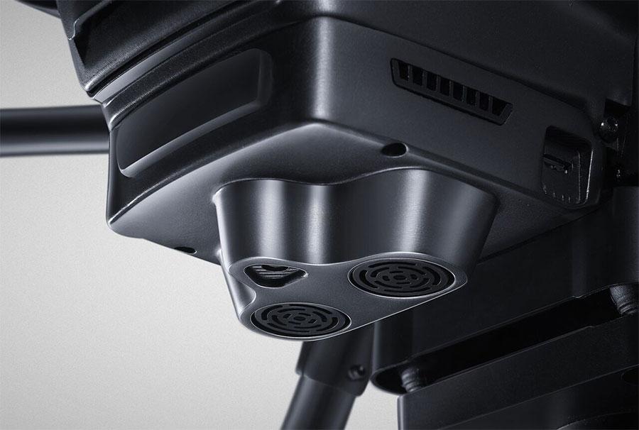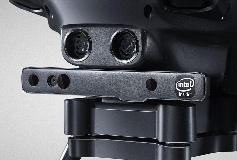 The Intel RealSense R200 camera allows the drone to fly autonomously and navigate around objects. The camera combined with the Atom processor allows the drone to map and learn the environment in 3D so it can intelligently avoid obstacles and select an alternate route to avoid colliding with obstacles. The drone also has ultrasonic sensors that can stop the drone short of obstacles. Downward facing sensors help improve stability and enable flights outdoors and close to the ground even if GPS reception is poor.