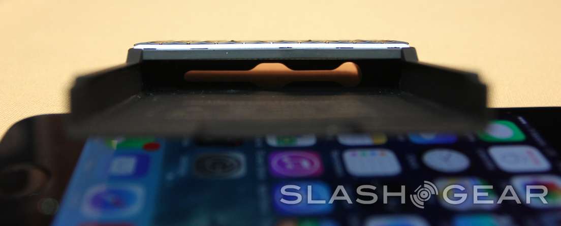 Here you're seeing the keyboard as it's attached to the iPhone 5s. This device is being allowed to work with the keyboard through Bluetooth, meaning you've got no physical connection to worry about – none of any kind. On the other hand you will need to recharge the keyboard every once in a while separate from the phone itself.