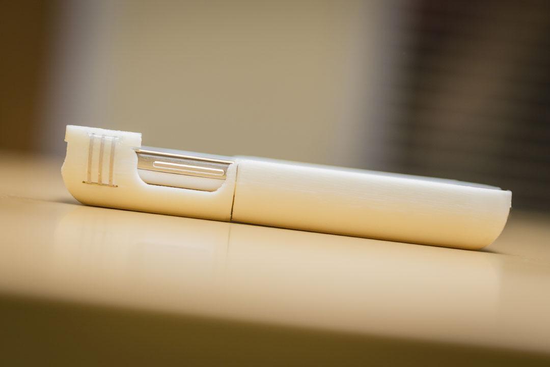 The second part of the device is a small one-time use pellet with enzymes inside that magnetically attached to the sensor on the case. Those pellets are in a 3D printed stylus on the side of the smartphone case. To use the diabetic would put a pellet onto the sensor using the stylus and that sensor would measure glucose concentration and send that via Bluetooth to the smartphone app.