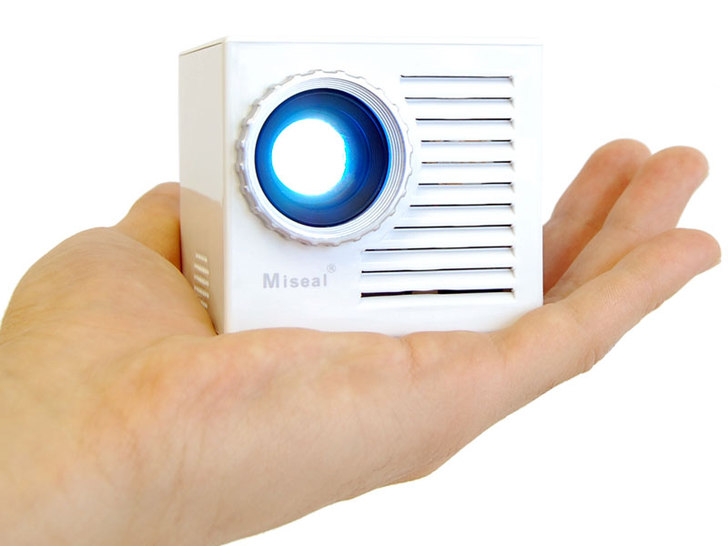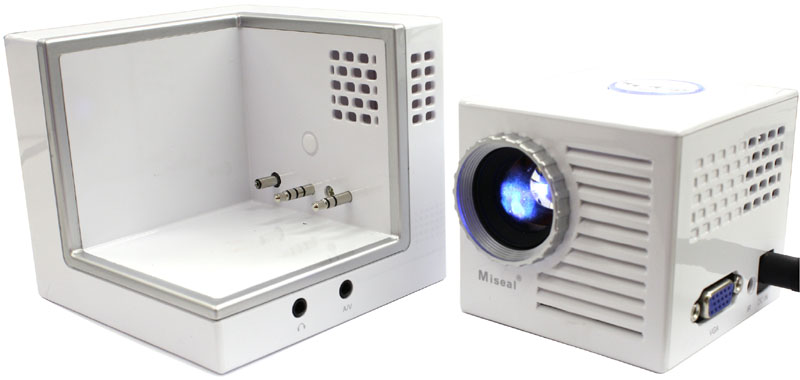 The Miseal mini is a LCOS based projector with SVGA, 800x600 resolution. The light source uses white LED to illuminate 25 lumens of image at 100:1 contrast. It fits nicely in a cube measures nearly 70mm on each size, and weights at a mere 0.6 pound. Despite small in size, the miniature beamer can display up to 112-inch diagonal from 16 feet throwing distance.