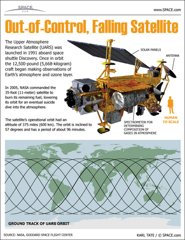 Back in 1992, NASA crammed the gigantic bus-sized Upper Atmosphere Research Satellite (UARS) into the cargo bay of the Space Shuttle Discovery on mission STS-48. The UARS weighs in at 6.5 tons and was used to study the atmosphere to determine the chemical compounds in the upper atmosphere and how they contribute to the climate around the globe. The satellite was decommissioned back in 2005 and NASA ordered the satellite to fire its thrusters and put the UARS on path to plummet to a fiery death on its descent into the atmosphere.