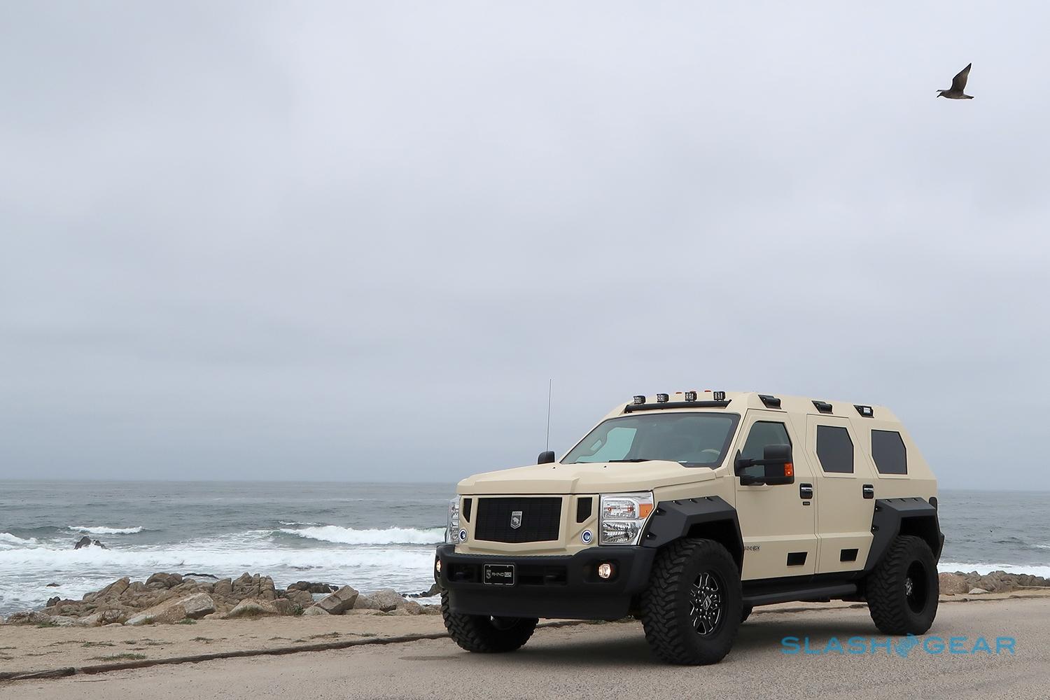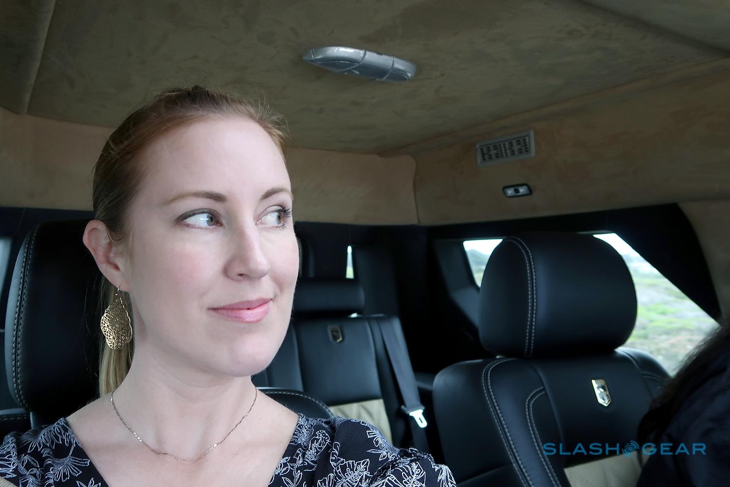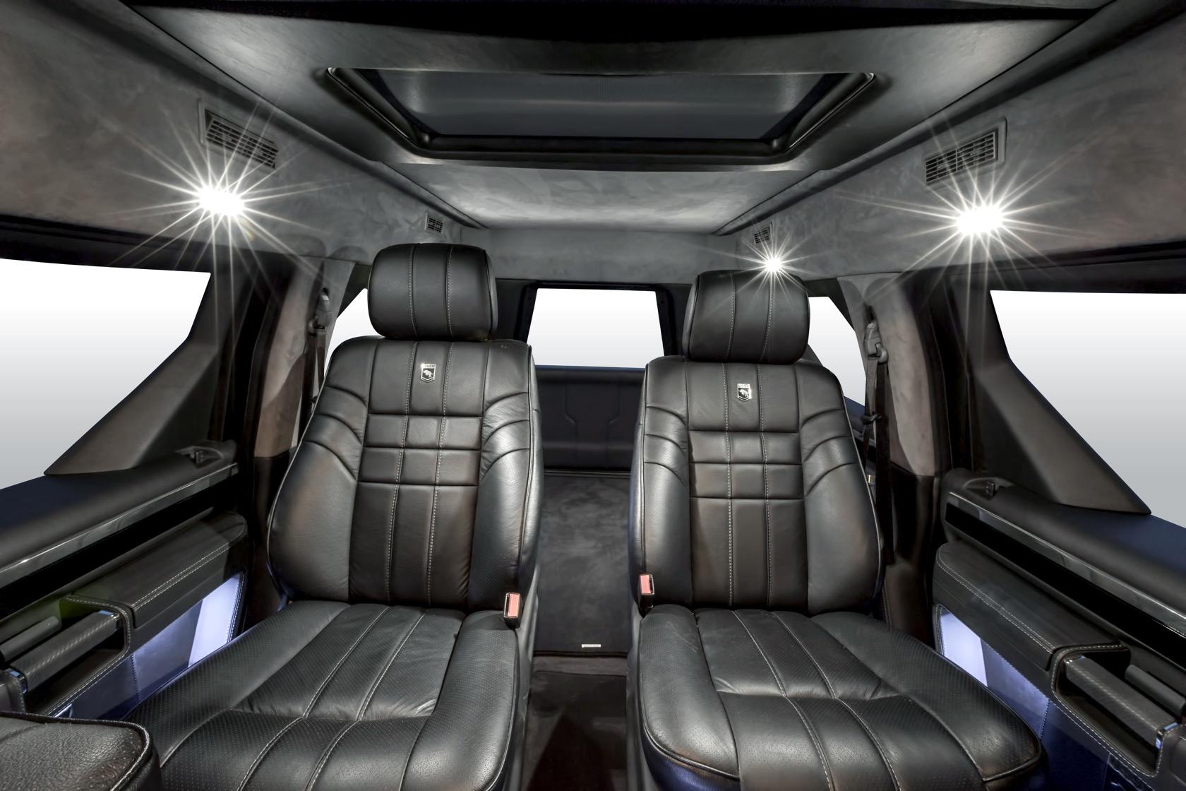 Inside is where the main incongruity lies. While the Rhino might be all tough hide on the outside, the cabin is fit for limo duty. Plenty of leather and gadgetry, all to make you feel more confident about the six-figure price tag.