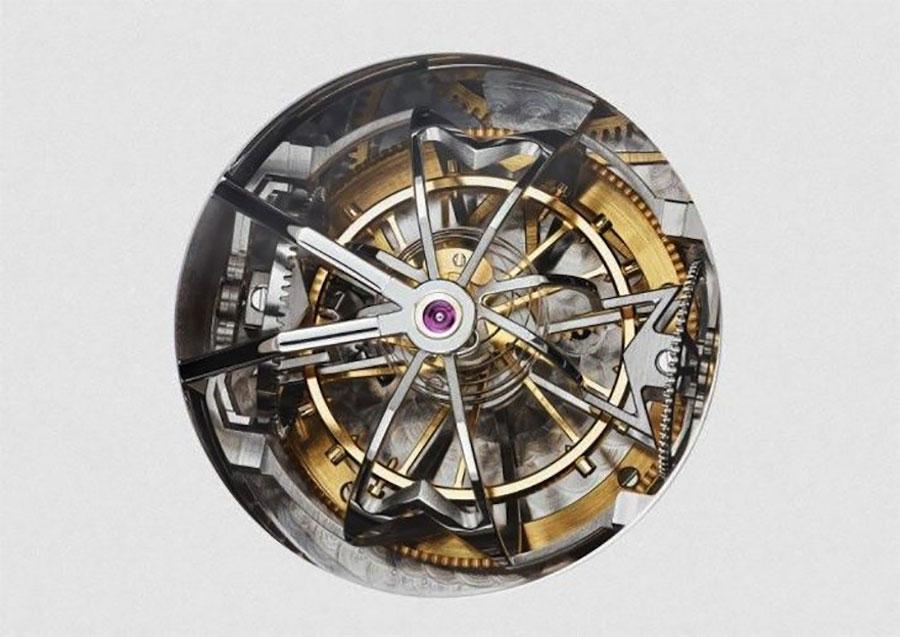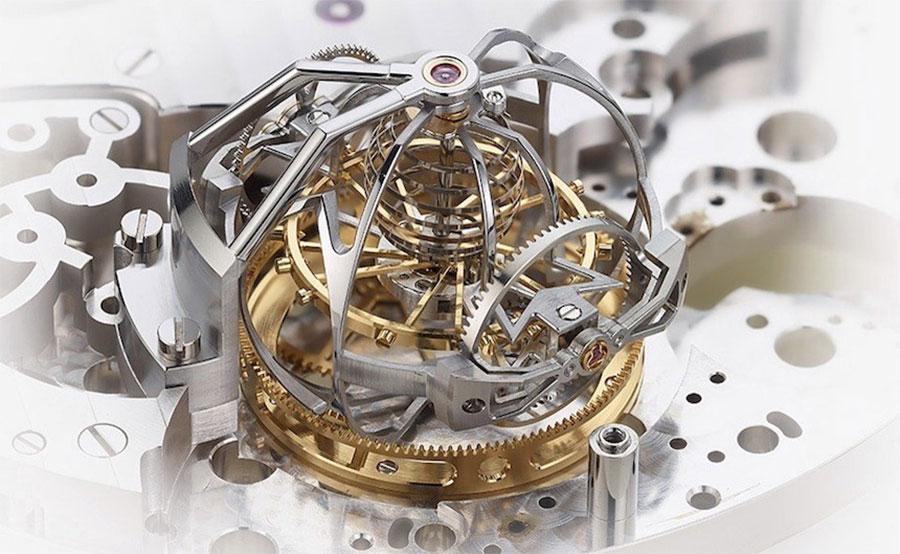 The features and complications of the watch include hours, minutes, and seconds hands, armillary sphere tourbillion, triple-axis tourbillion, world time indication with a separate display for 12 hours and minutes, day, and day-night display. The watch has a balance wheel with variable inertia and spherical hairspring.