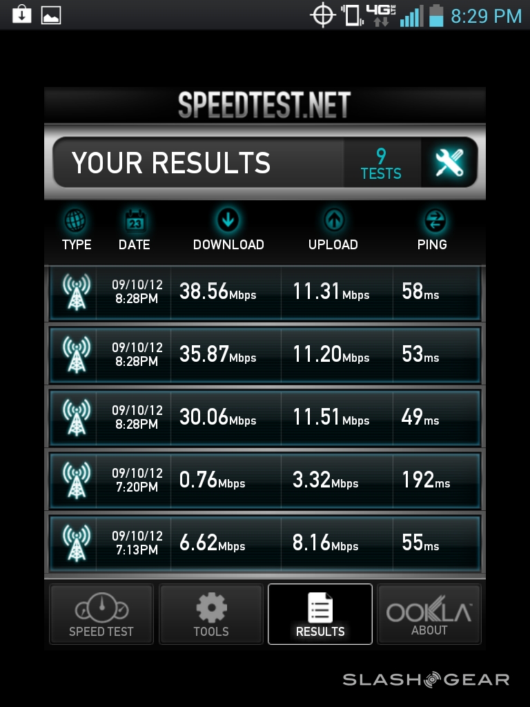 If you're a person who uses their device every 10 minutes, you may have to charge the device once halfway through the day. If you're a regular person who works with their smartphone every half-hour or so, you'll probably be good to go for your whole workday. This device uses a 2080 mAh non-removable battery, by the way, just a bit bigger than the Motorola DROID RAZR M (which has a 2000 mAh, massive for a device of its size.) This device, once again, runs on Verizon's 4G LTE network which you can see rocking quite well in the speed tests included here: