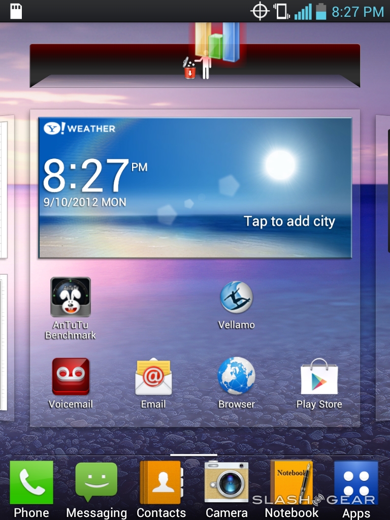 Inside of this device you'll find LG's newest user interface working with Android 4.0 Ice Cream Sandwich. You've got the regular awesome abilities of ICS such as a Recent Apps button – included in an odd set for this device in the physical row – notice how there's a menu button in there too, this being a unique set for any Android device thus far released to the market. The lockscreen here allows you to do a simple unlock by swiping across any part of the screen, or you can swipe through any one of five app shortcuts to go there too – pull down your notifications work on the lockscreen as well.