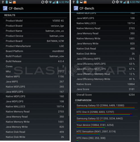 This device has 1GB of RAM inside alongside a dual-core Snapdragon S3 processor clocked at 1.5GHz. That's basically the same as what we saw in the tiny LG Lucid back in March of this year. LG informs us that the S3 should be perfectly capable of bringing on awesome "multitasking muscle" even if it's not the newest architecture on the block – and for the most part we've seen that to be true in everyday use. Have a peek at a few benchmark tests here to see how it adds up: