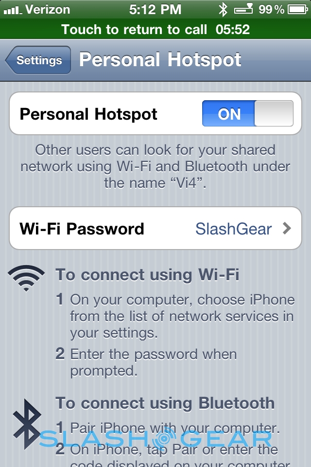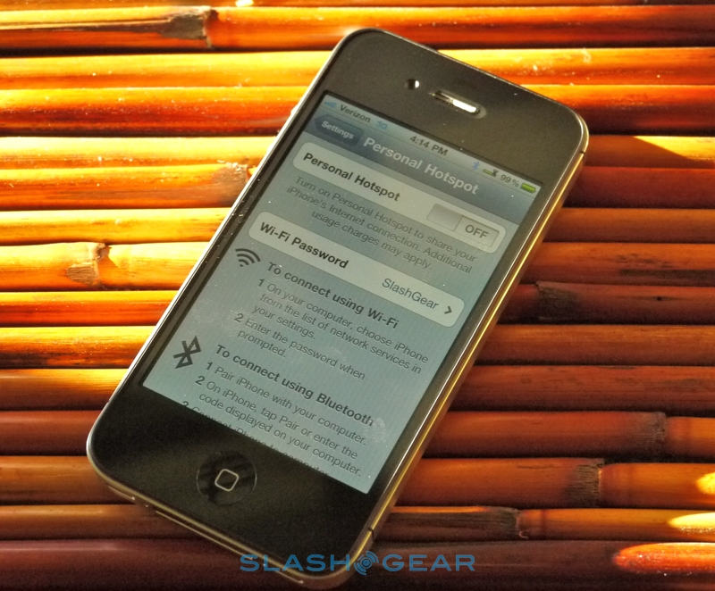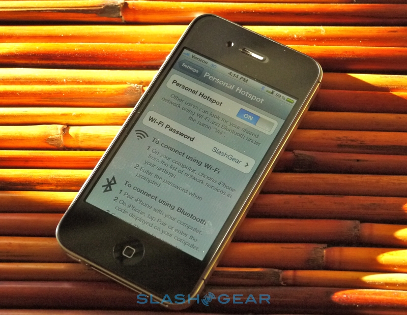 The only significant difference in software is the Personal Hotspot feature, which allows users to turn the iPhone 4 into a MiFi-style mobile hotspot. Up to five WiFi-connected clients can access the smartphone's EVDO Rev.A data connection at any one time, though it's worth noting that Verizon will charge extra for tethering use. To save battery power, the Personal Hotspot automatically powers down after five minutes of inactivity or no connections.