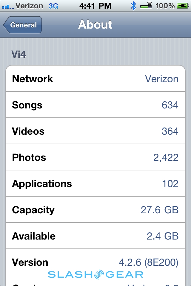 The iPhone 4 originally launched running iOS 4.0, a significant update to the platform that added multitasking support along with background processes, conversation views in the messaging apps, homescreen folders and other improvements. Incremental updates since than have brought us to iOS 4.2.1 on the GSM version, though the CDMA model will launch with iOS 4.2.6 with some small UI changes and the Personal Hotspot feature in the settings. You still get the AirPlay wireless audio streaming and AirPrint wireless printer functionality of iOS 4.2, along with Game Center access and HDR photography from iOS 4.1.