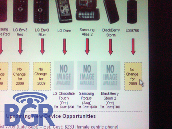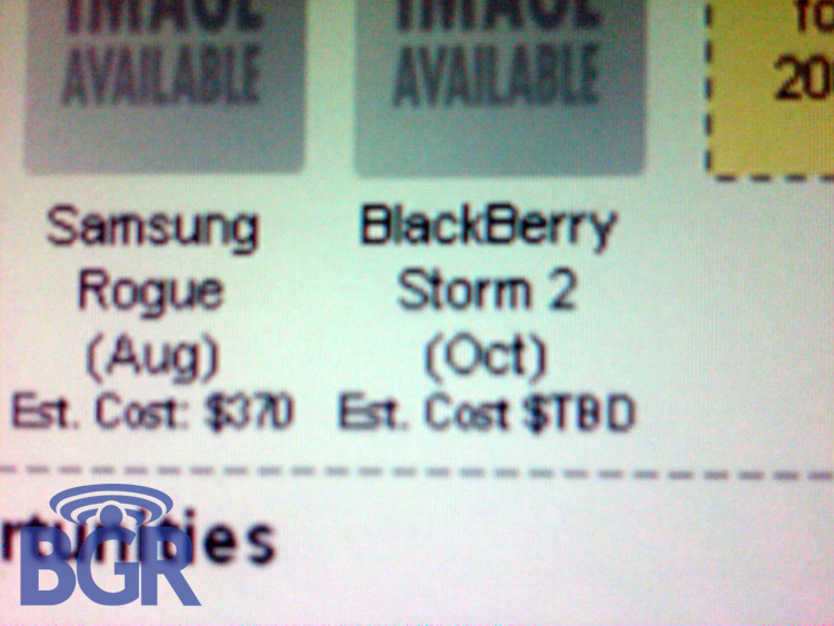 The RIM devices include the BlackBerry Storm 2, which is tipped to land in October (though yet to be priced), as well as the BlackBerry Curve 2 in late November. No details or images of that latter device, but it's presumed to be the Curve 8530 with CDMA and WiFi support.