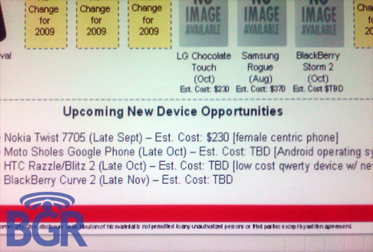 Elsewhere there's the LG Chocolate Touch (no confirmation on whether this is the same device as the BL40) dropping in October for around $230, the Android-based Motorola Sholes in late October (price TBD) and the HTC Razzle/Blitz 2 at the same time. There'll also be a "female centric" Nokia, the Twist 7705, in late September, priced at $230.