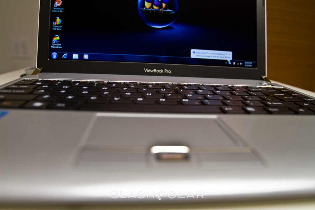 While we'd rather have seen a more modern chicklet-style keyboard, the VNB131's 'board is sturdy and flex-free. There's obviously no room for a separate numeric keypad, but generally the layout is decent. In-between the trackpad keys there's a fingerprint scanner for security, which worked as well as expected.