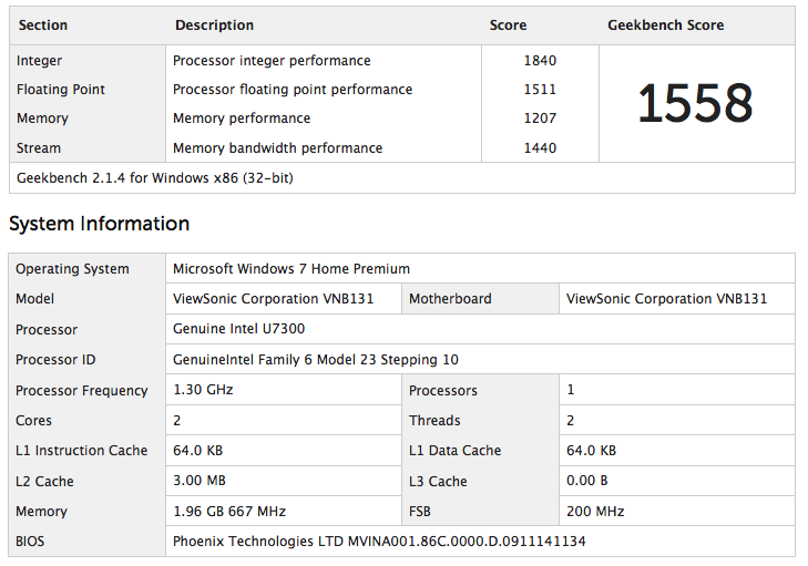 We loaded up Geekbench – a synthetic test of processor and memory performance – and the VNB131 scored surprisingly well. An overall score of 1558 was mainly held back by the DDR2 memory, with the processor steaming ahead in comparison. True, when you contrast that to even a 15 month old MacBook Air, the Viewsonic falls short, but in general use we had no problems multitasking with several browser tabs, email, IM and media open. Even during HD video playback we noticed no extremes of heat being generated. This isn't the machine for gaming, but as an everyday ultraportable it's certainly capable.