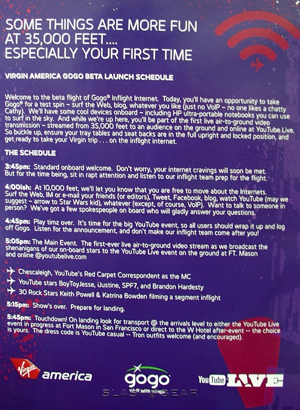 SlashGear is taking to the skies later on today, for Virgin America's WiFi Launch Beta Flight. The first demonstration of the in-flight internet service, we'll be brushing aside the complementary rice crackers in favor of surfing the internet. Then, we'll be heading straight for the YouTube Live event, to bring you all the details.