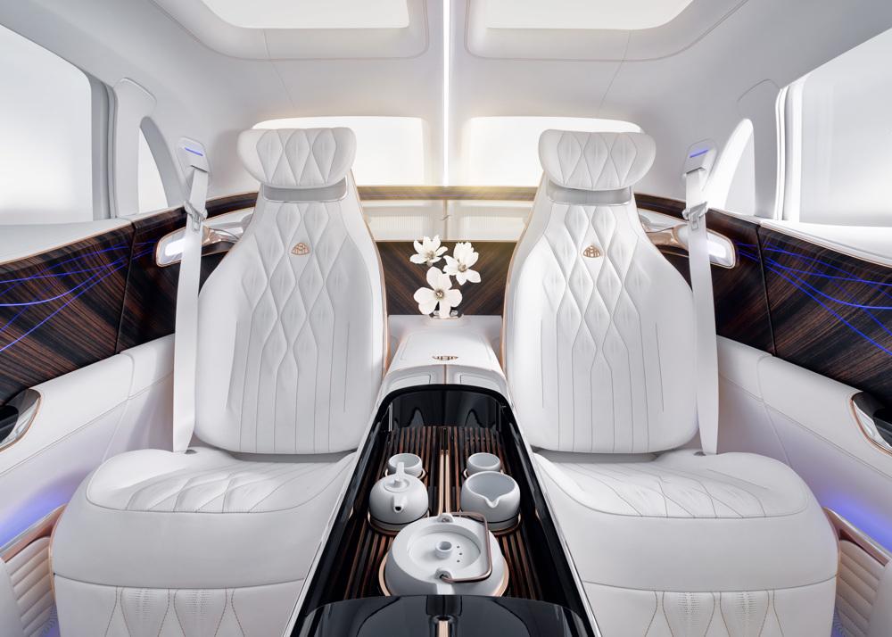 The harmonious contrasting elements continue inside, with while and pale colors common in luxury cars accented by "Magic Wood" ebony popular in Chinese furniture. The spacious comforts of a sedan is contrasted by the higher seating position typical in an SUV. Unlike most concept cars that put the emphasis on the driver, the chauffer-driven theme of the Vision Mercedes-Maybach Ultimate Luxury puts the spotlight on the passengers on rear seats instead. In contrast to the beautiful but bare essentials of the front, the rear passengers have all the attention and luxury afforded to them, including a tea service integrated into the wide center console that extends through the rear.