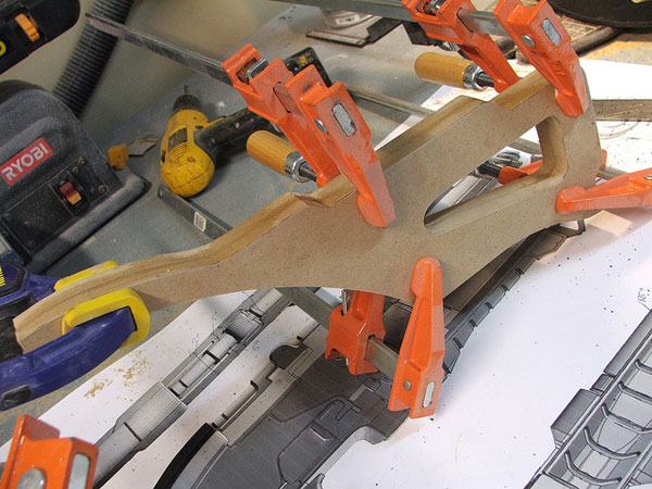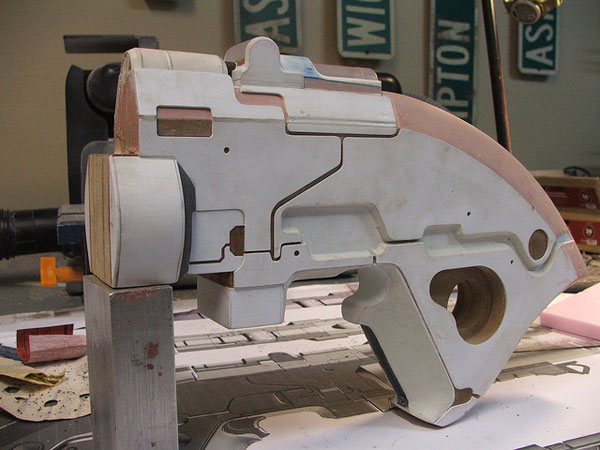 The weapon started at MDF and a bunch of glue. The cracks and gaps were filled with bondo, foam and clay, and then molds were made to get rubber parts. The finished weapon looks like it is waiting for someone to pick it up and start a firefight. I wonder how much the finished weapon weighs. This prop is so cool!