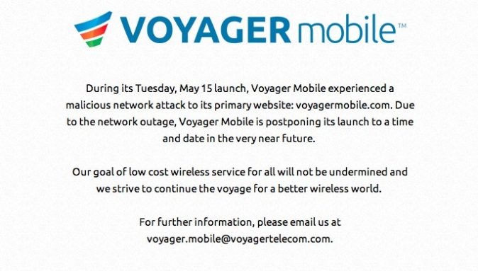 "During its Tuesday, May 15 launch, Voyager Mobile experienced a malicious network attack to its primary website: voyagermobile.com. Due to the network outage, Voyager Mobile is postponing its launch to a time and date in the very near future" the company said in a statement today. "Our goal of low cost wireless service for all will not be undermined and we strive to continue the voyage for a better wireless world."
