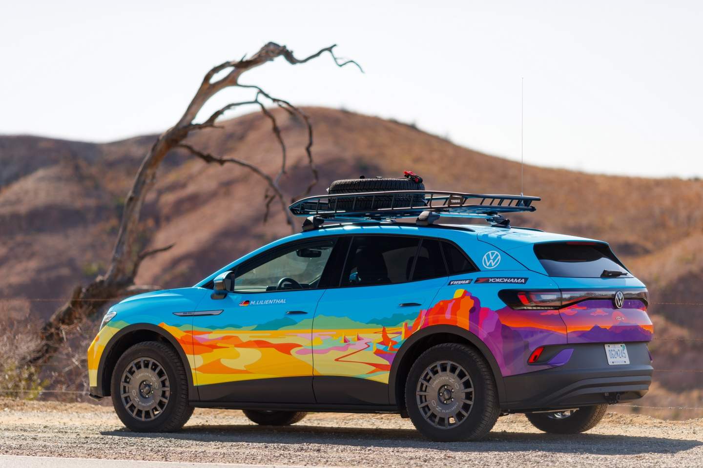 The rally-prepped VW ID.4 AWD Pro has new suspension components and tubular control arms. It also has fabricated steel plates, battery casing reinforcements, and new wheels wrapped in chunky Yokohama Geolandar A/T tires. Other goodies include a Thule roof rack and a custom body wrap created by Salt Lake-based artist Liz Kuz.
