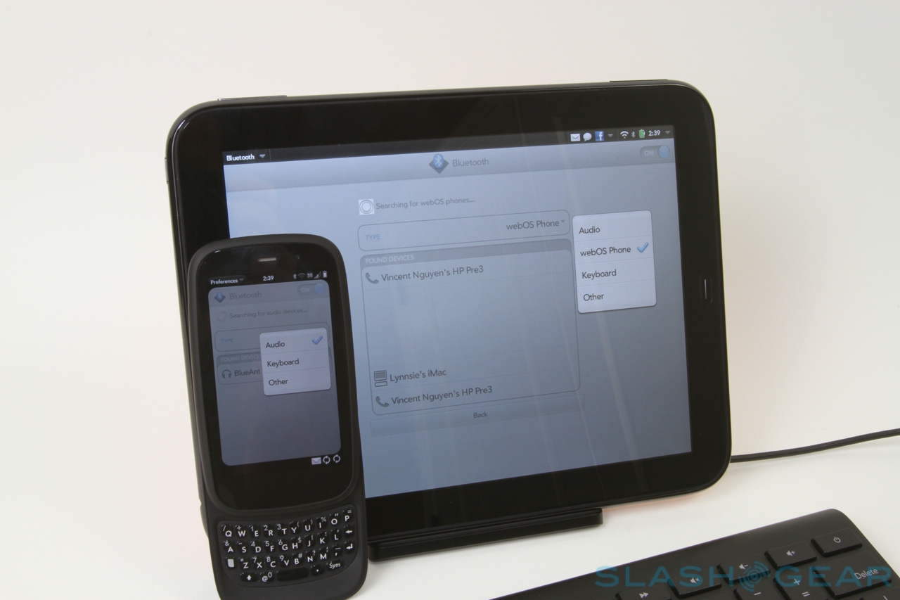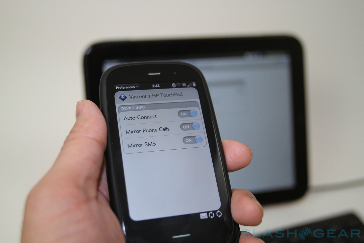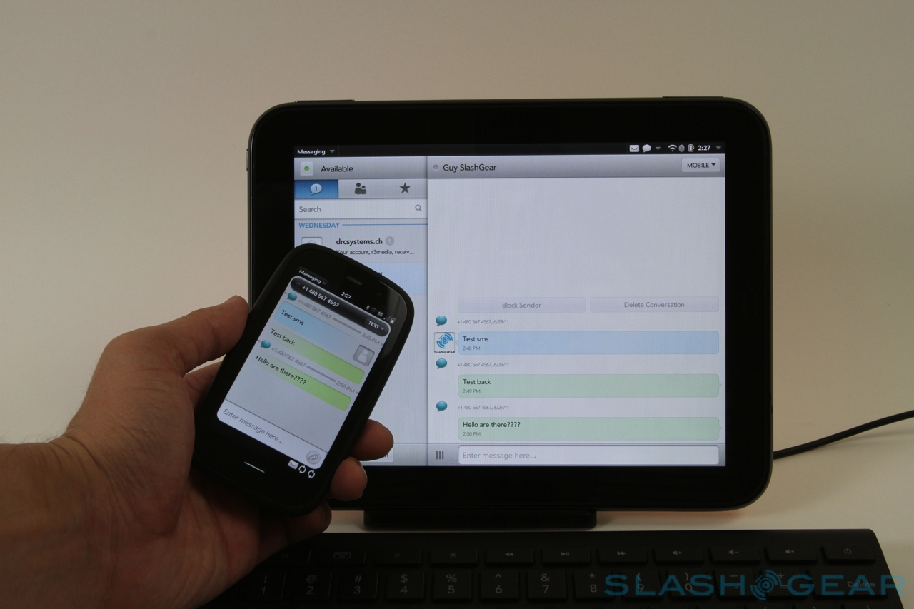 Similarly, once the two are paired, they maintain a Bluetooth link and any incoming calls or SMS messages to the Pre3 are flagged up on the TouchPad. As we covered before, you can reply to SMS directly from the tablet itself, seamlessly mixing texts in with IM conversations, while calls are remotely answered on the phone.