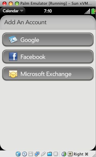 What the Synergy settings page – which shows Microsoft Exchange, Facebook and Google options – doesn't tell us is how many of each account is simultaneously supported. Many people have more than one Google or Exchange account they'd like to use, and so far it's unclear whether having them all active on the Pre will be entirely possible.