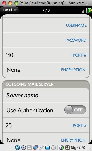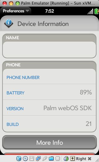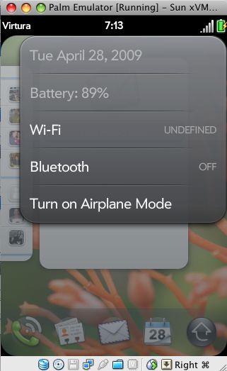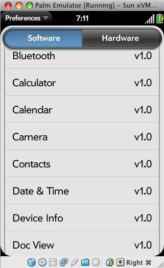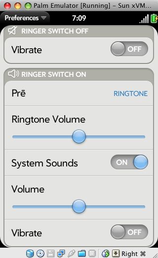 The shots were not taken on a Pre handset, but from the Palm Emulator which developers can use to test their code without having a physical device. There's no particularly fresh information contained in the images – we're particularly disappointed to see no sign of the YouTube application that was spotted in the wild earlier this month – but it's always a pleasure to see Palm's well-designed menus.