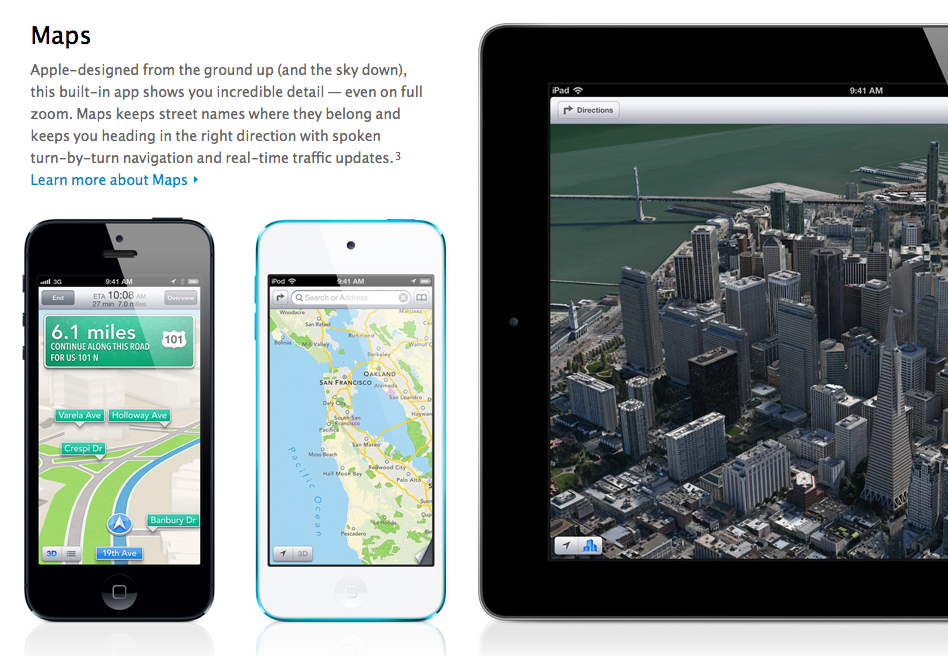 - Turn-by-turn navigation with spoken directions on iPhone 5, iPhone 4S, iPad Wi-Fi + Cellular (2nd and 3rd generation)